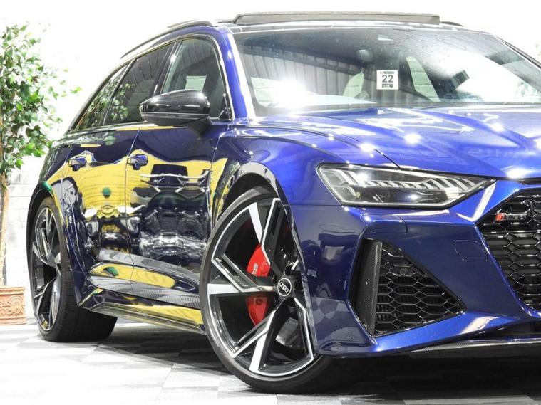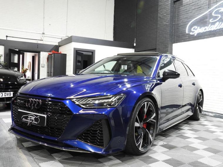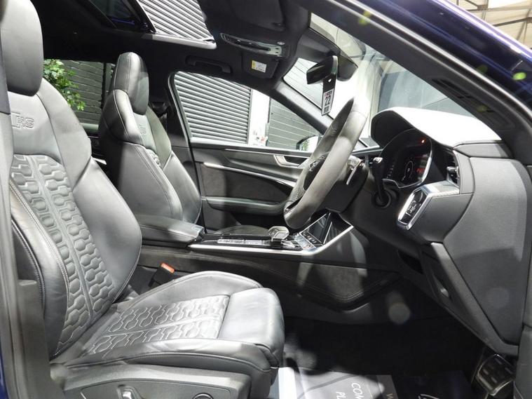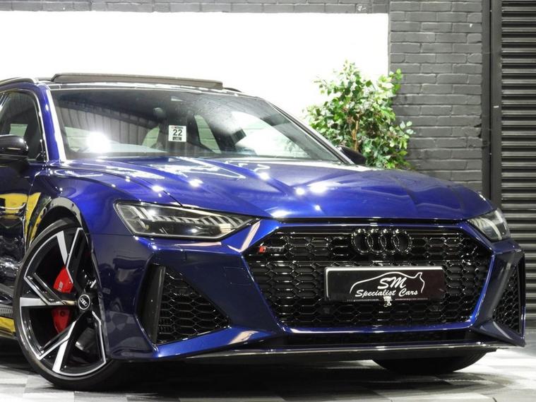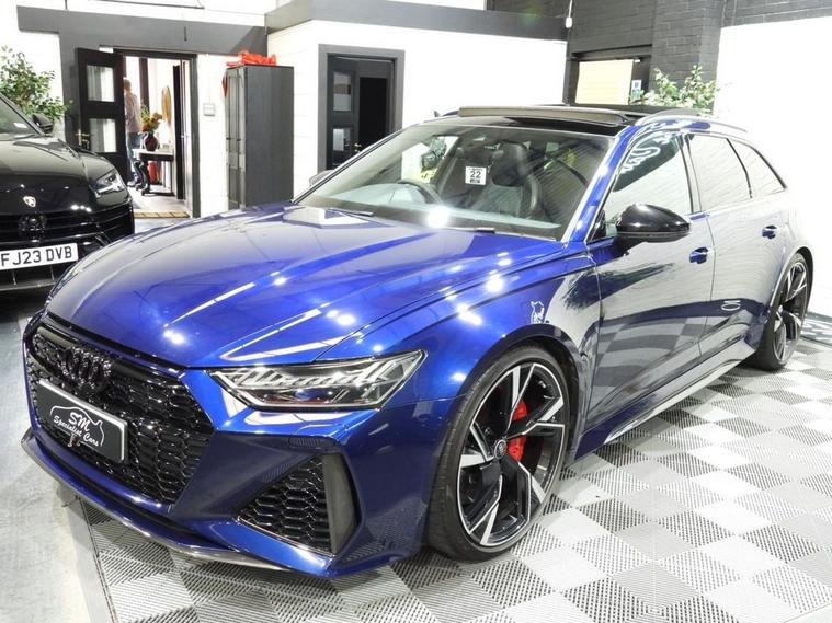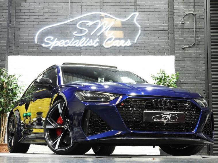 VAT QUALIFYING - 1 OWNER - ONLY 34K WITH AUDI SERVICE HISTORY - PANORAMIC SUNROOF - This 2021 Audi RS6 Avant TFSI V8 Carbon Black is a truly exceptional example, boasting a clear vehicle history and having been owned by just one careful keeper. This striking performance estate features a powerful 4.0L V8 petrol engine paired with a sophisticated four wheel drive system, ensuring dynamic handling and impressive road presence. As a Euro 6 compliant vehicle, it meets stringent emission standards. The RS6 Avant is renowned for its blend of exhilarating performance and everyday practicality. Its remarkable acceleration, capable of reaching 0-60mph in a mere 3.6 seconds, places it firmly in supercar territory, a significant advantage over many other vehicles in its class. Furthermore, this model offers generous boot space, making it an ideal choice for those who require both speed and versatility without compromise.