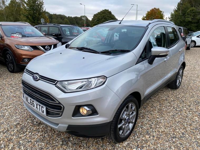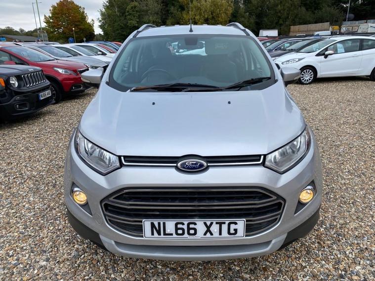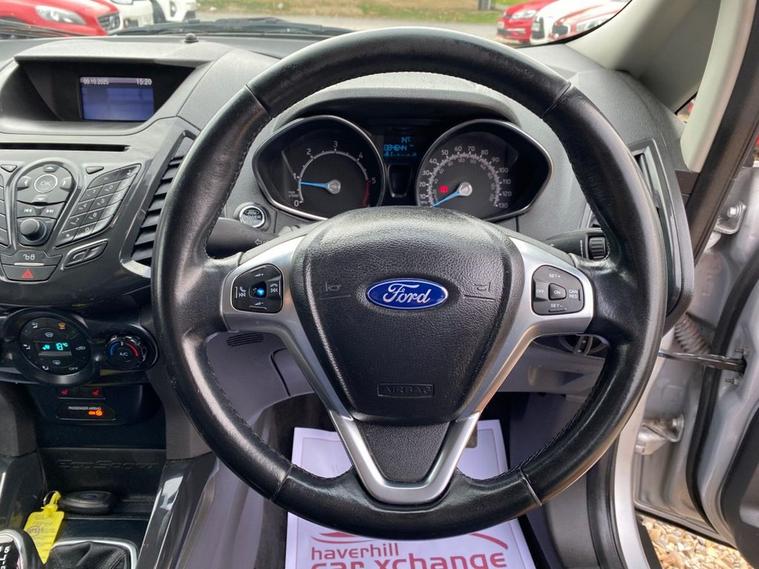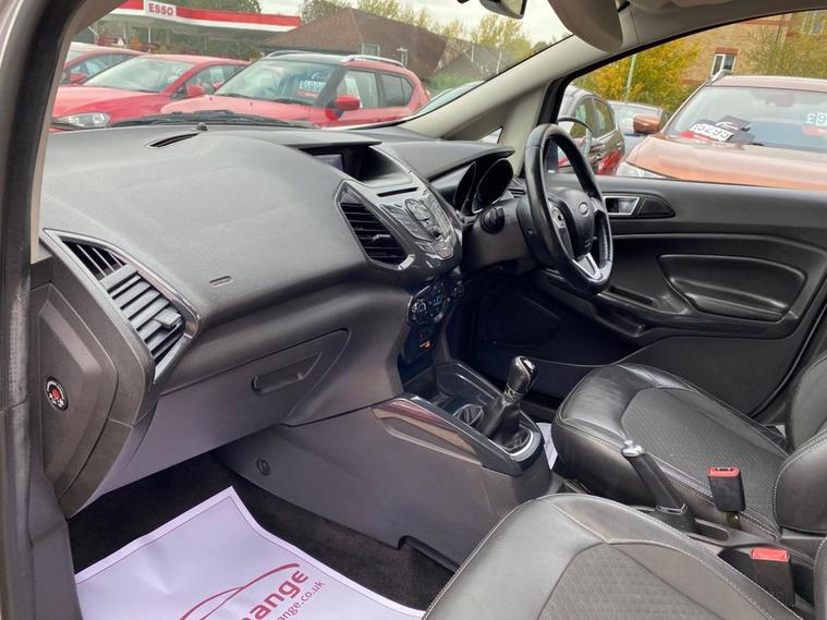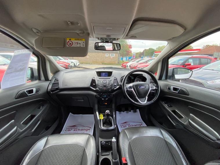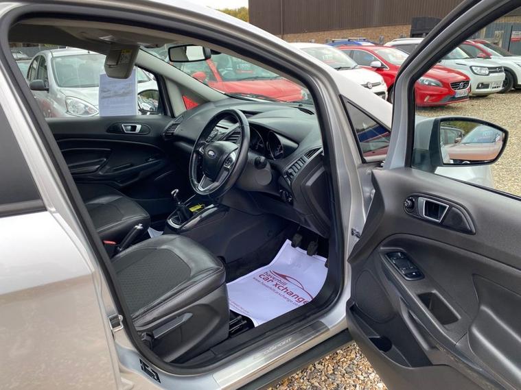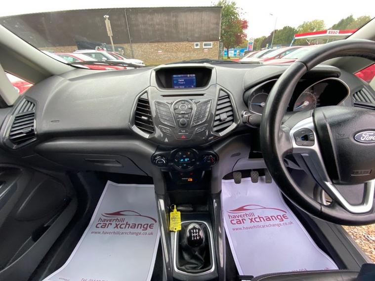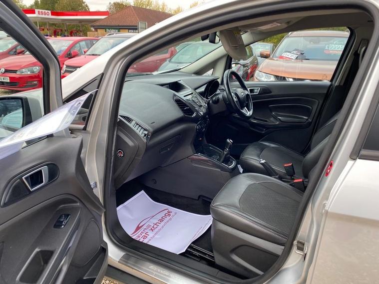 ONLY £35 A YEAR ROAD TAX+LONG MOT UNTIL 16.08.2026+RADIO-CD PLAYER+CLIMATE CONTROL AIR-CONDITIONING+AUTOMATIC HEADLIGHT ACTIVATION+RAIN-SENSING WINDSCREEN WIPERS+PARKING ASSISTANCE+HEATED HALF LEATHER UPHOLSTERY+METALLIC MOONDUST SILVER PAINT+17 INCH ALLOY WHEELS. At Haverhill Car Xchange we would like to offer you our Ford Ecosport Titanium SUV which has been finished in a metallic Moondust Silver paint with luxurious HEATED Charcoal-Black half leather and cloth upholstery. Specification Includes Radio-CD Player, Front and Rear 12 Volt Power Socket, Automatic Climate Control Air-Conditioning, Gear Shift Indicator, Cruise Control, Front Electric Windows with One-Touch Opening/Closing on Drivers Side, Body Coloured Bumpers/Door Handles/Door Mirrors with Integrated Side Indicators and Rear Roof Spoiler, Silver Roof Rails, Chrome Lower Front Grille, Silver Scuff plates, Automatic Halogen Headlight Activation, Front Fog Lights with Integrated Daytime Running Lights and Chrome Surrounds, Auto Dimming Rear View Mirror, Rain-Sensing Windscreen Wipers, Parking Assistance, Multifunction Steering Wheel, 17 Inch Alloy Wheels, Electric Power Assisted Steering, ABS Breaking System, Airbags, Alarm, Immobiliser, Remote Central Locking and ISOFIX Anchorage Points for Child Seats.