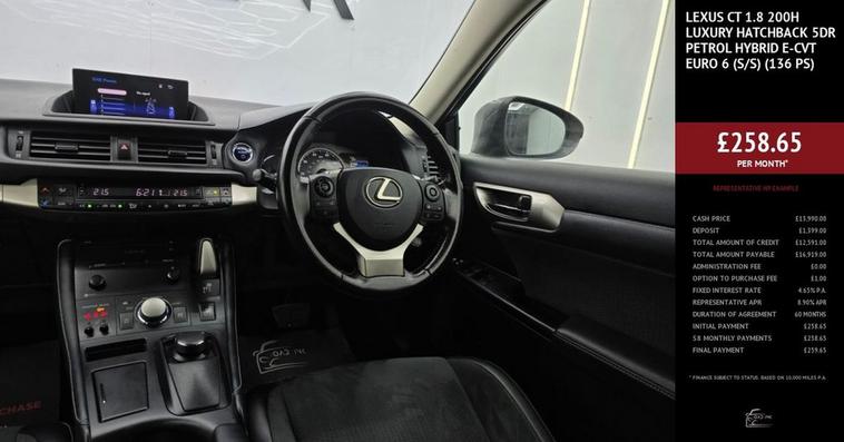 Lexus CT200h Luxury Meets Efficiency Experience the perfect blend of style, technology and comfort with this Lexus CT200h. Featuring 17 Alloy Wheels, LED Daytime Running Lights, and a sleek Rear Spoiler, it delivers elegance with a sporty edge. Inside, enjoy Heated Front Seats, Dual Zone Climate Control, Bluetooth & DAB Radio, and the Lexus Navigation System for a connected drive. Safety is top priority with Lexus Safety System+, Reversing Camera, Autonomous Emergency Braking, and Parking Sensors front & rear. With Driving Modes EV, Eco, Normal & Sport, you can tailor every journey to your style efficient, smooth, or spirited.