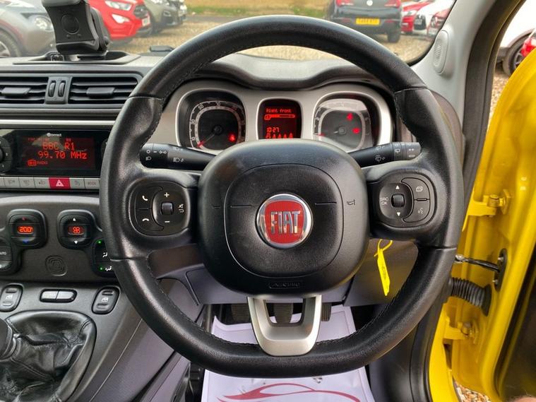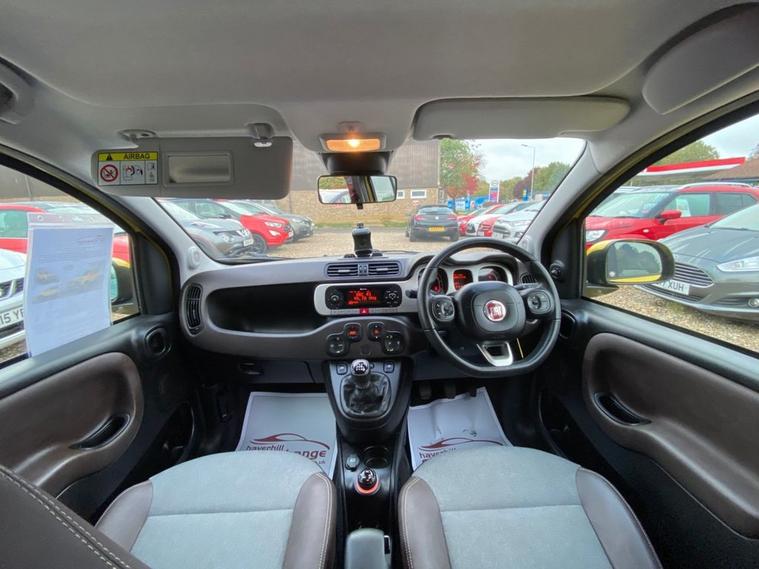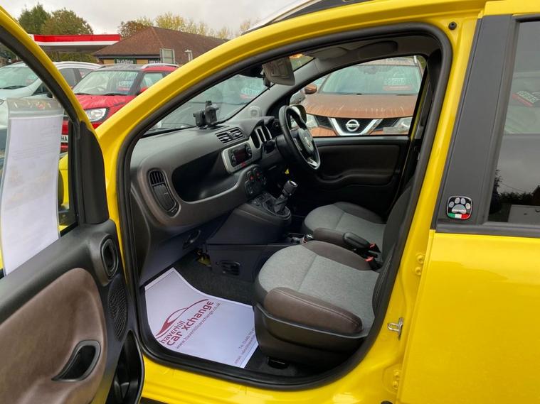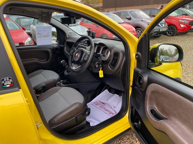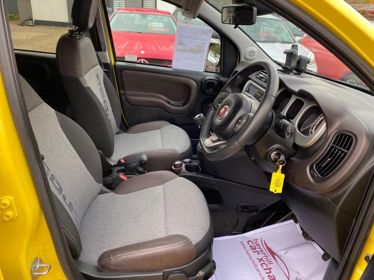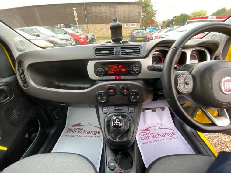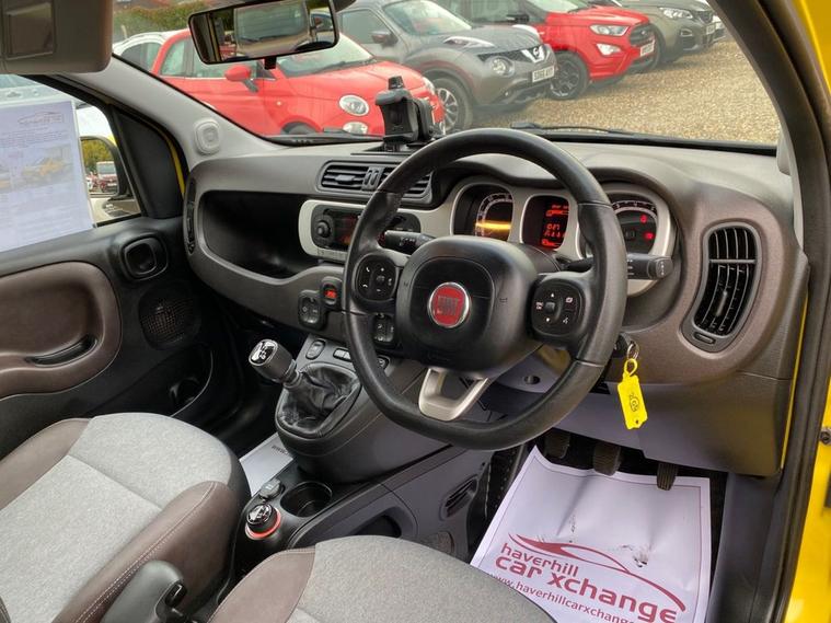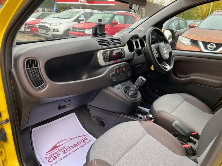 ONLY 20, 248 MILES+£1, 800 OF FEATURES+LONG MOT UNTIL 21.09.2026+DAB RADIO+BLUETOOTH+AIR-CONDITIONING+WINTER PACK+COMFORT KIT+HALF LEATHER UPHOLSTERY+PARKING ASSISTANCE+TROPICALLA YELLOW PAINT+15 INCH ALLOY WHEELS. At Haverhill Car Xchange we would like to offer you our EXTREMELY LOW MILEAGE Fiat Panda TwinAir Cross Hatchback which has been finished in a Tropicalla Yellow paint with luxurious Grey-Brown half leather and cloth upholstery. Specification Includes DAB Radio, Bluetooth and Smartphone Cradle, USB, AUX-IN, 12 Volt Power Socket, Automatic Climate Control Air-Conditioning, Front Electric Windows, Body Coloured Door Mirrors, Black Door Handles, Front and Rear Bumpers with Ultrashine Silver Skid Plates, Side Strips in ultrashine Silver Cross Logo, Ultrashine Roof Bars, Front Fog Lights, Comfort Kit, Winter Pack, Parking Assistance, Tinted Windows, 15 Inch Alloy Wheel, City Break Control, All Terrain Selector, Dualdrive Power Steering, Hill Holder, ABS Breaking System, Airbags and Remote Central Locking.