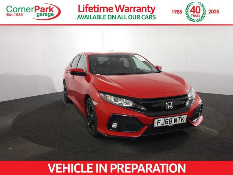 2 Owners. Service history with 3 services. Last serviced at 49, 514 miles. Introducing the 2019 Honda Civic 1.0 VTEC Turbo SR, a sporty and sophisticated 5-door petrol hatchback delivering a blend of exhilarating performance and advanced technology. Finished in striking Rallye Red with 17-inch alloy wheels, a sleek black grille, and privacy glass, this Euro 6 manual comes with chrome window garnish surround and body-coloured door handles and mirrors with integrated indicators. The sporty exterior is complemented by halogen headlights with auto on-off and dusk sensor, LED daytime running lights, and a shark fin antenna. Powered by a responsive 1.0-litre turbocharged engine producing 126ps, the Civic SR delivers dynamic driving with smooth power delivery and excellent fuel efficiency. Inside, the cabin features dual-zone automatic climate control, Honda CONNECT with GARMIN navigation, an 8-speaker audio system, Bluetooth hands-free telephone, and a multifunction leather steering wheel with remote audio controls. The driver enjoys manual height adjustment and power lumbar support on the sports front seats, with LED ambient lighting and a colour driver information display creating an inviting atmosphere. Safety is comprehensive with advanced systems including Collision Mitigation Braking System (CMBS), lane departure warning, lane keep assist, road departure mitigation, forward collision warning, and intelligent adaptive cruise control. Additional features include Electronic Brakeforce Distribution (EBD), Vehicle Stability Assist (VSA), ISOFIX mounting points on rear seats, parking sensors front and rear with rear parking camera, rain-sensing wipers, capless fuel filler, and super locking for peace of mind. The 2019 Honda Civic SR combines sporty styling, cutting-edge technology, and top safety in a versatile and practical hatchback.