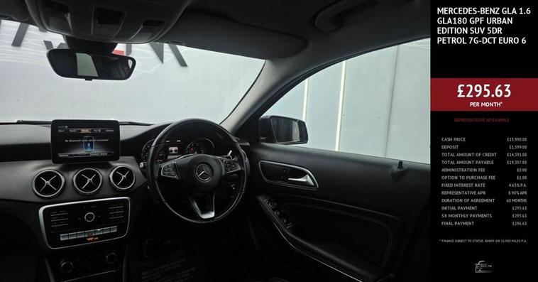 The Mercedes-Benz GLA 180 Urban Edition blends premium style with everyday practicality. Finished with 18 gloss black alloys and the Night Package, it looks sleek from every angle. Inside, you get Nappa leather trim, sports seats, and an 8 media display with Smartphone Integration and Reversing Camera. Enjoy smooth driving with the 7G-DCT automatic gearbox, Dynamic Select driving modes, and comfort suspension for a refined ride. Safety is first-class with Active Braking Assist, ATTENTION Assist, multiple airbags, and LED headlights. A perfect compact luxury SUV efficient, stylish, and ideal for city or motorway driving.