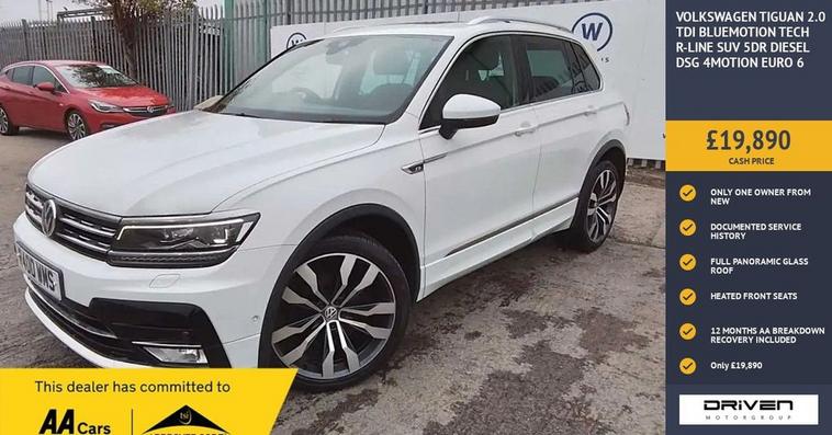 VOLKSWAGEN TIGUAN 2.0 TDI BLUEMOTION TECH R-LINE SUV 5DR DIESEL DSG 4MOTION FINISHED IN WHITE AND COMPLIMENTED WITH PART LEATHER INTERIOR, THIS VEHICLE HAS BEEN VERY WELL CARED FOR AND MAINTAINED WITH DOCUMENTED SERVICE HISTORY PLUS COMPREHENSIVE PRE DELIVERY HEALTH CHECK COMPLETED PRIOR TO SALE 43946 MILES. KEY FEATURES INCLUDE ALLOY WHEELS, ALARM, AMBIENT LIGHTING, BLUETOOTH, CRUISE CONTROL, TOUCHSCREEN SATALLITE NAVIGATION, ELECTRIC FOLDING DOOR MIRRORS, IMMOBILISER, HEATED FRONT SEATS, HEATED WASHER JETS, LANE ASSIST, FULL GLASS PANORAMIC ROOF, R-LINE STYLING, DAB RADIO, CD PLAYER, AIR CONDITIONING, FRONT AND REAR PARKING SENSORS, TINTED WINDOWS PLUS MUCH MORE. COMMITTED TO AA CARS STANDARDS: 3 MONTHS OR 3000 MILES WARRANTY INCLUDED WITH AN OPTION TO UPGRADE: 12 MONTHS AA BREAKDOWN RECOVERY INCLUDED: £75.00 CONTRIBUTION TOWARDS YOUR NEXT SERVICE/MOT AT ANY AA CARS STANDARD APPROVED WORKSHOP: WE STAND BY THE QUALITY OF OUR VEHICLES. WITH THE PURCHASE OF THIS VEHICLE, YOU WILL RECEIVE 3 MONTHS OR 3000 WARRANTY, 12 MONTHS AA BREAKDOWN RECOVERY, GIVING YOU ADDITIONAL PEACE OF MIND AND PROTECTION. ALL OUR CARS COME WITH AT LEAST 6 MONTHS MOT AND PRE SALE HEALTH CHECK AND ROAD TEST. OUR PROFESSIONAL TEAM ENSURES YOUR VEHICLE STAYS IN TOP CONDITION, AND YOU ENJOY A HASSLE-FREE OWNERSHIP EXPERIENCE. 4.6 STARS ON GOOGLE WITH OVER 550 REVIEWS: JOIN OUR COMMUNITY OF SATISFIED CUSTOMERS! OUR DEALERSHIP IS PROUD TO HAVE A 4.6 STAR RATING ON GOOGLE, BACKED BY OVER 550 POSITIVE REVIEWS. WE ARE COMMITTED TO PROVIDING EXCELLENT SERVICE AND HIGH-QUALITY VEHICLES. This Vehicle Comes Equipped with High Specification, Which Includes: -
