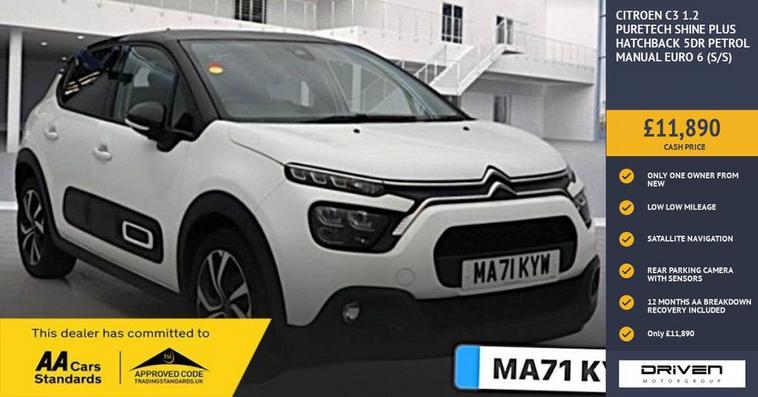 CITROEN C3 1.2 PURETECH SHINE PLUS FINISHED IN WHITE AND COMPLIMENTED WITH TWO TONE CHARCOAL INTERIOR, THIS VEHICLE HAS BEEN VERY WELL CARED FOR AND MAINTAINED WITH DOCUMENTED SERVICE HISTORY PLUS COMPREHENSIVE PRE DELIVERY HEALTH CHECK COMPLETED PRIOR TO SALE 6362 MILES. KEY FEATURES INCLUDE ALLOY WHEELS, ALARM, AIR CONDITIONING, CITROEN CONNECT SATALLITE NAVIGATION, CRUISE CONTROL WITH SPEED LIMITER, TINTED WINDOWS, ELECTRIC HEATED DOOR MIRRORS, ONE TOUCH ELECTRIC WINDOWS, LANE ASSIST, REAR PARKING SENSORS WITH REAR CAMERA PLUS MUCH MORE. COMMITTED TO AA CARS STANDARDS: 3 MONTHS OR 3000 MILES WARRANTY INCLUDED WITH AN OPTION TO UPGRADE: 12 MONTHS AA BREAKDOWN RECOVERY INCLUDED: £75.00 CONTRIBUTION TOWARDS YOUR NEXT SERVICE/MOT AT ANY AA CARS STANDARD APPROVED WORKSHOP: WE STAND BY THE QUALITY OF OUR VEHICLES. WITH THE PURCHASE OF THIS VEHICLE, YOU WILL RECEIVE 3 MONTHS OR 3000 WARRANTY, 12 MONTHS AA BREAKDOWN RECOVERY, GIVING YOU ADDITIONAL PEACE OF MIND AND PROTECTION. ALL OUR CARS COME WITH AT LEAST 6 MONTHS MOT AND PRE SALE HEALTH CHECK AND ROAD TEST. OUR PROFESSIONAL TEAM ENSURES YOUR VEHICLE STAYS IN TOP CONDITION, AND YOU ENJOY A HASSLE-FREE OWNERSHIP EXPERIENCE. 4.6 STARS ON GOOGLE WITH OVER 550 REVIEWS: JOIN OUR COMMUNITY OF SATISFIED CUSTOMERS! OUR DEALERSHIP IS PROUD TO HAVE A 4.6 STAR RATING ON GOOGLE, BACKED BY OVER 550 POSITIVE REVIEWS. WE ARE COMMITTED TO PROVIDING EXCELLENT SERVICE AND HIGH-QUALITY VEHICLES. This Vehicle Comes Equipped with High Specification, Which Includes: -