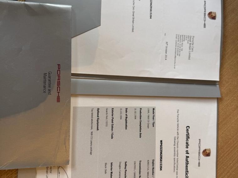 1994 Porsche 968 ClubSport 3.0 - Porsche Certificate Of Authenticity & letter from Porsche GB Originally delivered new by Douglas Cameron Porsche on 31/03/1994 , this exceptional example represents one of just 179 UK right-hand-drive 968 Sports ever produced, with only 134 known to remain on the road today. Finished in Guards Red over black cloth interior, the car presents superbly and benefits from a comprehensive service history, boasting 21 recorded services up to 112, 670 miles to 2024. Also to note In 2023, over £6, 000 was invested, including new cam belts (invoice on file). This vehicle has had only three previous keepers, underscoring its well-preserved and carefully maintained provenance.