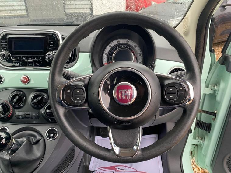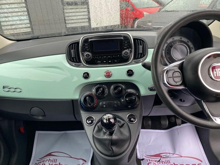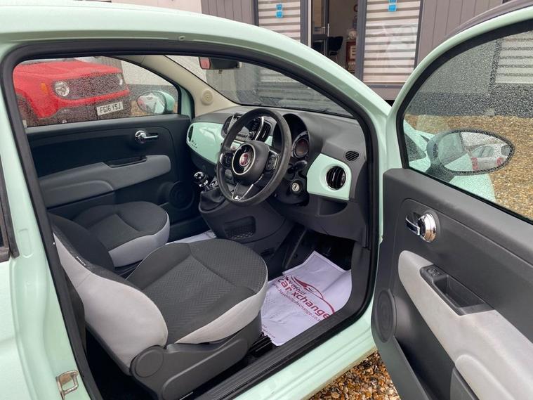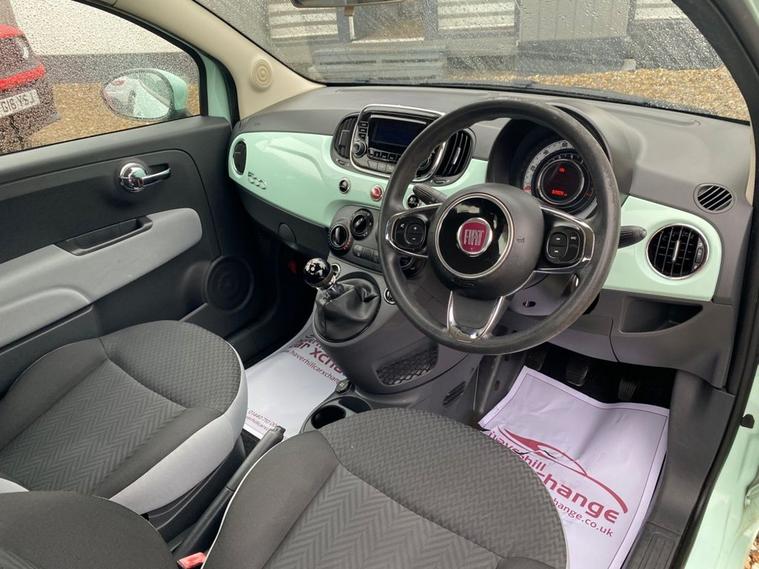 LONG MOT UNTIL 07.05.2026+RADIO-USB-AUX PORTS+AIR-CONDITIONING+ELECTRIC WINDOWS+LED DAYTIME RUNNING LIGHTS+DUALDRIVE POWER STEERING+SMOOTH MINT PAINT+15 INCH ALLOY WHEELS. At Haverhill Car Xchange we would like to offer you our Fiat 500 ECO Pop Star Hatchback which has been finished in a Smooth Mint paint, Black-Grey-Light Grey with Black Ambience Cloth upholstery. Specification Includes Radio with USB and AUX, Air-Conditioning, Gear Efficiency Indicator, Electric Front Windows, Body Coloured Bumpers, Chrome Plated Door Handles, LED Daytime Running Lights, Front Seats with Memory Function, Steering Wheel, Heated Rear Window, 15 Inch Alloy Wheels, Automatic Door Locking, ABS Breaking System, Airbags, Remote Central Locking and ISOFIX Anchorage Points for Child Seats.