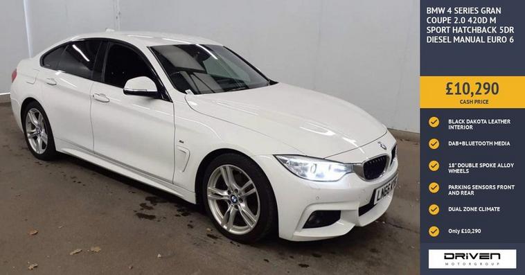 BMW 4 SERIES 2.0 420D M SPORT GRAND COUPE 5DR DIESEL FINISHED IN ALPINE WHITE AND COMPLIMENTED WITH DAKOTA FULL LEATHER INTERIOR, THIS VEHICLE HAS BEEN VERY WELL CARED FOR AND MAINTAINED WITH SERVICE HISTORY AT 17092, 29502, 32445, 49522 MILES PLUS COMPREHENSIVE PRE DELIVERY HEALTH CHECK AND SERVICE PRIOR TO SALE . KEY FEATURES INCLUDE BLACK DAKOTA LEATHER, DUAL ZONE CLIMATE CONTROL, BLUETOOTH, FRONT AND REAR PARKING SENSORS, DUAL ZONE CLIMATE CONTROL, COLOUR DISPLAY SCREEN, ALARM, BLUETOOTH WITH USB AUDIO, BMW SATALLITE NAVIGATION, CD PLAYER WITH MP3, DAB RADIO, AUTOMATIC LIGHTS, AUTOMATIC WINDOWS, MULTIFUNCTIONAL STEERING WHEEL PLUS MUCH MORE COMMITTED TO AA CARS STANDARDS: 3 MONTHS OR 3000 MILES WARRANTY INCLUDED WITH AN OPTION TO UPGRADE: 12 MONTHS AA BREAKDOWN RECOVERY INCLUDED: £75.00 CONTRIBUTION TOWARDS YOUR NEXT SERVICE/MOT AT ANY AA CARS STANDARD APPROVED WORKSHOP: WE STAND BY THE QUALITY OF OUR VEHICLES. WITH THE PURCHASE OF THIS VEHICLE, YOU WILL RECEIVE 3 MONTHS OR 3000 WARRANTY, 12 MONTHS AA BREAKDOWN RECOVERY, GIVING YOU ADDITIONAL PEACE OF MIND AND PROTECTION. ALL OUR CARS COME WITH AT LEAST 6 MONTHS MOT AND PRE SALE HEALTH CHECK AND ROAD TEST. OUR PROFESSIONAL TEAM ENSURES YOUR VEHICLE STAYS IN TOP CONDITION, AND YOU ENJOY A HASSLE-FREE OWNERSHIP EXPERIENCE. 4.7 STARS ON GOOGLE WITH OVER 550 REVIEWS: JOIN OUR COMMUNITY OF SATISFIED CUSTOMERS! OUR DEALERSHIP IS PROUD TO HAVE A 4.7 STAR RATING ON GOOGLE, BACKED BY OVER 550 POSITIVE REVIEWS. WE ARE COMMITTED TO PROVIDING EXCELLENT SERVICE AND HIGH-QUALITY VEHICLES. This Vehicle Comes Equipped with High Specification, Which Includes: -