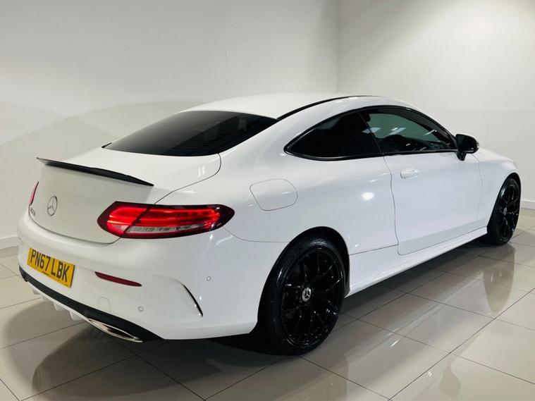 Mercedes-Benz C-Class 2.0 C200 AMG Line Coupe 2dr Petrol G-Tronic+ Euro 6 (s/s) (184 ps) Registration: PN67LBK | 59, 000 miles | Service History | AA Inspected | Finished in Polar White with Black Artico Leather Interior A superb example of the Mercedes-Benz C200 AMG Line Coupe, finished in striking Polar White with a Black Artico leather and Alcantara interior. Combining sleek coupe styling with refined performance and premium comfort, this C-Class stands out thanks to its 19 Gloss Black upgraded alloy wheels, Privacy Glass, and Rear Lip Spoiler, giving it a bold, sporty presence Powered by the refined 2.0-litre turbocharged petrol engine producing 184 PS, paired with the smooth 9G-Tronic+ automatic transmission, it delivers strong performance, excellent economy, and a luxurious driving experience. Fully Euro 6 compliant and ULEZ friendly, its a perfect blend of efficiency, elegance and AMG character Key Features 2.0-litre turbocharged petrol engine (184 PS) 9G-Tronic+ automatic transmission with paddle shift Euro 6 ULEZ compliant AMG Line styling with sport suspension and aerodynamic body kit Upgraded 19 Gloss Black AMG alloy wheels Rear Lip Spoiler Privacy Glass LED headlights and LED taillights Dual-zone automatic climate control Reversing camera with front and rear parking sensors Cruise control with speed limiter Heated front sport seats Artico leather and Alcantara upholstery with contrast stitching Flat-bottom AMG multifunction steering wheel Mercedes infotainment system with Bluetooth, USB and DAB radio Optional Equipment Polar White paint finish Upgraded 19 Gloss Black AMG Style wheels Rear Lip Spoiler Privacy Glass Front and rear carpet mats Additional Information 59, 000 miles covered Service History Combined economy around 45+ mpg (depending on driving conditions) 0 to 62 mph in approximately 7.5 seconds Road tax: £180 per year A stylish and low-mileage Mercedes-Benz C200 AMG Line Coupe finished in Polar White, enhanced by 19 Gloss Black alloys, Privacy Glass and Rear Lip Spoiler a truly elegant yet sporty example