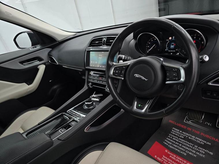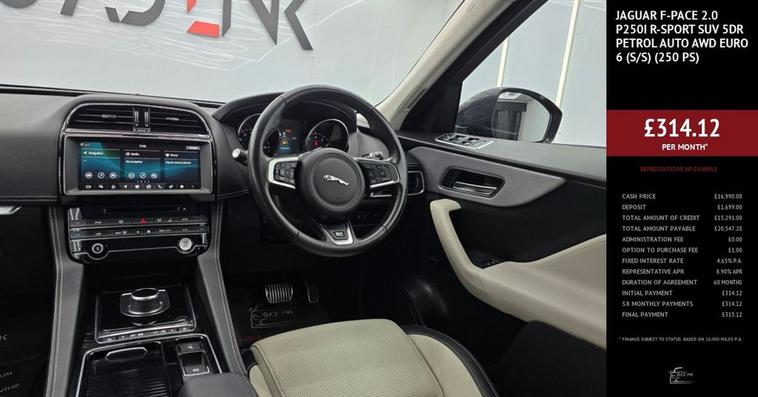 Jaguar F-PACE 2019 R-Sport AWD a stylish, refined SUV with real road presence. Finished with 19 diamond-cut alloys, R-Sport exterior styling and gloss black roof rails for a clean, sporty look. Inside, you get heated sports seats, ambient interior lighting, Ebony Suede headlining and a premium feel throughout. Tech is sorted with the 10 Touch Pro screen, Apple CarPlay / Android Auto, Navigation Pro, DAB, Bluetooth, and JaguarDrive Control. The Rear Camera and front & rear parking sensors make manoeuvring simple, while the powered tailgate adds everyday practicality. Backed by All-Wheel Drive with torque vectoring, its stable and confident in all conditions while still smooth and comfortable. A smart, well-specced example of Jaguars premium performance SUV.