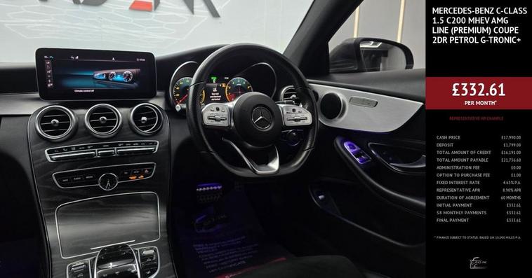 This Mercedes-Benz C200 AMG Line Premium Coupe combines sporty styling with comfort and refinement. Powered by a 1.5 MHEV petrol engine and smooth G-Tronic+ automatic gearbox, it delivers both performance and efficiency. Finished with 18 AMG Aero alloys, AMG bodystyling, and a diamond grille, it looks every bit as sharp as it drives. Inside, enjoy heated sports seats, a 10.25 multimedia display, Apple CarPlay/Android Auto, reversing camera, Premium Package, LED headlights, and Adaptive Cruise Control. With Dynamic Select drive modes, sports suspension, and a high-quality interior, this C-Class Coupe blends luxury and sport in perfect balance.