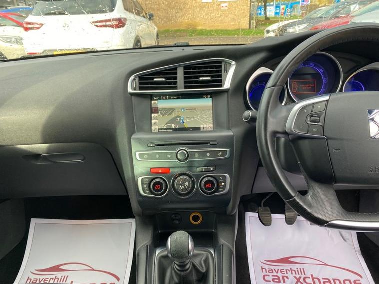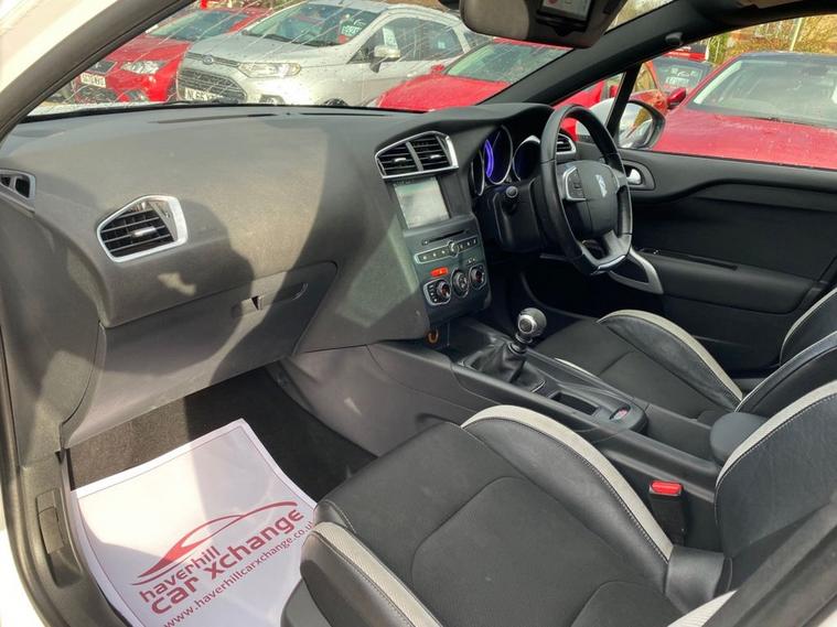 59.509 MILES+ONLY £35 A YEAR ROAD TAX+LONG MOT UNTIL 04.06.2026+SERVICE HISTORY+7 INCH TOUCHSCREEN SATELLITE NAVIGATION SYSTEM+BLUETOOTH HANDSFREE+DUAL ZONE CLIMATE CONTROL AIR-CONDITIONING+AUTOMATIC HEADLIGHT ACTIVATION+RAIN-SENSING WINDSCREEN WIPERS+PARKING ASSISTANCE+PANORAMIC WINDSCREEN+POLAR WHITE PAINT+18 INCH ALLOY WHEELS. At Haverhill Car Xchange we would like to offer you our LOW MILEAGE Citroen DS4 DStyle Nav Hatchback which has been finished in a Polar White paint with Black Sao Cloth and Leather upholstery. Specification Includes a 7Inch Touchscreen Satellite Navigation System with European Mapping, Live Traffic Information, DAB Radio, Bluetooth Music Streaming, Bluetooth Handsfree, USB, Auxiliary Socket, Jack Socket, 12 Volt Power Socket, Dual Zone Climate Control Air-Conditioning, Gear Efficiency Indicator, Cruise Control with Speed Limiter, Front Electric Windows, Body Coloured Bumpers/Door Handles/Door Mirrors and Rear Roof Spoiler, Automatic Halogen Headlight Activation, LED Daytime Running Lights, Guide Me Home Headlight Function, Front Fog Lights with Cornering Function, High Level Third Break Light, Rain-Sensing Windscreen Wipers, Parking Assistance, Leather Multifunction Steering Wheel, Front Sports Seats, Tinted Glass, 18 Inch Alloy Wheels, Hill Start Assist, Automatic Door and Boot Locking when Moving in Motion, ABS Breaking System, Airbags, Alarm, Immobiliser, Remote Central Locking and ISOFIX Anchorage Points for Child Seats.