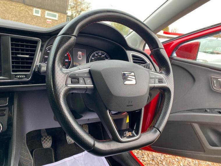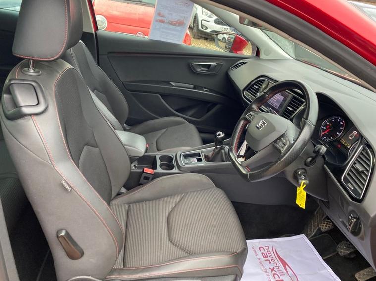 12 MONTHS MOT+MEDIA SYSTEM PLUS WHICH FEATURES SATELLITE NAVIGATION SYSTEM+SEAT FULL LINK SMARTPHONE INTEGRATION- MIRROR LINK-APPLE CAPLAY/GOOG ANDROID AUTO+CLIMATE CONTROL AIR-CONDITIONING+FULL LED HEADLIGHTS+PARKING ASSISTANCE+DESIRE RED PAINT+17 INCH ALLOY WHEELS. At Haverhill Car Xchange we would like to offer you our Seat Leon FR Technology Sport Coupe which has been finished in a Desire Red paint with Black Techny Cloth upholstery. Specification Include a Media Plus System, Satellite Navigation System, SEAT Full Link Smartphone Integration-Mirror Link-Apple CarPlay-Google Android Auto, 12 Volt Power Socket, SEAT Drive Profile, Dual Zone Climate Control Air-Conditioning, Cruise Control Gear Shift Indicator, Electric Front Windows, Body Coloured Bumpers/Door Handles/Door Mirrors and Rear Roof Spoiler, Black Radiator Grille, Full LED Headlights, Parking Assistance, Front Sports Seats, Flat-Bottomed Leather Steering Wheel with Red Stitching and FR Logo, Electric Parking Break including Autohold Function, 17 Inch Alloy Wheels, Power Assisted Steering, Hill Hold Control, ABS Breaking System, Airbags, Remote Central Locking and ISOFIX Anchorage Points for Child Seats.