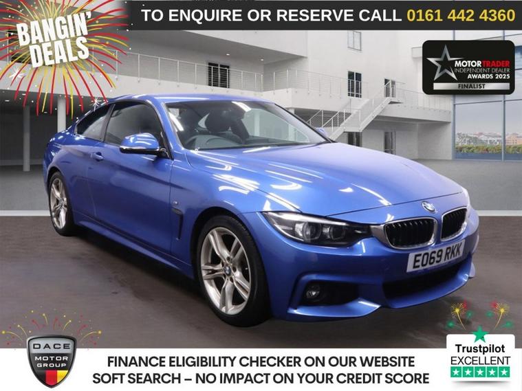 THIS BMW 4 SERIES 420i M SPORT IS FINISHED IN A STUNNING ESTORIL BLUE AND HAS BLACK LEATHER INTERIOR. IT COMES WITH EXCELLENT SERVICE HISTORY, HEATED FRONT SEATS, PRO NAVIGATION, 18 INCH ALLOYS, CRUISE CONTROL WITH BRAKE FUNCTION, FRONT AND REAR PARKING SENSORS, DAB DIGITAL RADIO, IN CAR ENTERTAINMENT, MULTI FUNCTION STEERING WHEEL, AUTO START / STOP FUNCTION, DUAL CLIMATE CONTROL, AIR CONDITIONING, ELECTRIC WINDOWS, ELECTRIC DOOR MIRRORS, RAIN SENSING WIPERS. F I N A N C E A V A I L A B L E - *** NOT SURE YOURE ELIGIBLE FOR CAR FINANCE? *** CHECK TODAY USING OUR FREE CAR FINANCE CHECKER ON OUR WEBSITE.*** Dace Motor Group have a dedicated team of finance experts waiting to help with your enquiry. Over the past 30 years we have forged relationships with the countrys largest and best finance houses. We are specialists in Hire Purchase (HP), Personal Contract Purchase (PCP) as well as assisting those with poor credit or previous credit problems - A B O U T U S - At Dace German Car Centre, we are very proud to have been named the first Trading Standards Approved Car Retailer, with process and procedures developed with and applauded by them. We do recommend that customers RESERVE their choice of vehicle prior to making their trip, to avoid potentially missing the car. Visit our website https:/ dealer's website At Dace German Car Centre Stockport we carry over 700 cars in group stock TO ENQUIRE OR RESERVE PLEASE CALL | 01616232259 W A R R A N T Y A V A I L A B L E - With effect from the 1st May 2024 the Warranty Solutions Group will be providing their highest level of national warranty cover on all of our cars + 3 MONTHS WARRANTY FREE + EXTENDED WARRANTIES AVAILABLE - A D V E R T A C C U R A C Y - Although we make effort to ensure the description of our vehicles is accurate, mistakes can happen. We are human after all! So, whether it is the exact specification of a vehicle you need clarifying, the service history dates and mileages, even the colour shade please speak to a member of our sales team and they will happily confirm all you need to know about this car. PLEASE NOTE our adverts can never be cited as the reason you have brought a car incorrectly, as no purchase can be completed without the customer physically examining the car. As such, the physical viewing and documentation provided for the vehicle is deemed to be the basis for the sale, not an advertisement that may on occasion contain an error. -