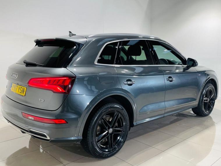 Audi Q5 2.0 TDI S line SUV 5dr Diesel S Tronic quattro Euro 6 (s/s) (190 ps) Registration: YY17YSN | 71, 000 miles | Service History | Finished in Daytona Grey with Black Edition Styling A superbly presented Audi Q5 2.0 TDI S line, finished in stunning Daytona Grey and enhanced with desirable factory upgrades including the Technology Pack, Comfort & Sound Pack, Electric Seats, and Privacy Glass. This example also benefits from freshly refinished Gloss Black Alloy Wheels, giving it a more aggressive and modern appearance Powered by the strong and efficient 2.0 TDI (190 PS) engine paired with the smooth S Tronic automatic gearbox and quattro all-wheel drive, the Q5 delivers refined performance, excellent grip and impressive comfort. As a Euro 6 diesel, it is fully ULEZ compliant Key Features 2.0 TDI diesel engine (190 PS) S Tronic automatic transmission quattro all-wheel drive Daytona Grey exterior Technology Pack upgraded MMI Navigation & Virtual Cockpit Comfort & Sound Pack enhanced Bang & Olufsen Audio System Electric Front Seats Privacy Glass Freshly Refinished Gloss Black Alloy Wheels S line styling & sports suspension LED headlights Black leather/Alcantara S line interior Flat-bottom S line steering wheel Front & rear parking sensors Cruise control DAB radio, Bluetooth & smartphone interface Electric tailgate Additional Information 71, 000 miles covered Service History Euro 6 ULEZ compliant AA 128 Point Inspection Passed Road tax: £195 per year A highly specified Audi Q5 S line, finished in Daytona Grey with premium upgrade packs and gloss black styling, offering outstanding comfort, refinement and everyday practicality