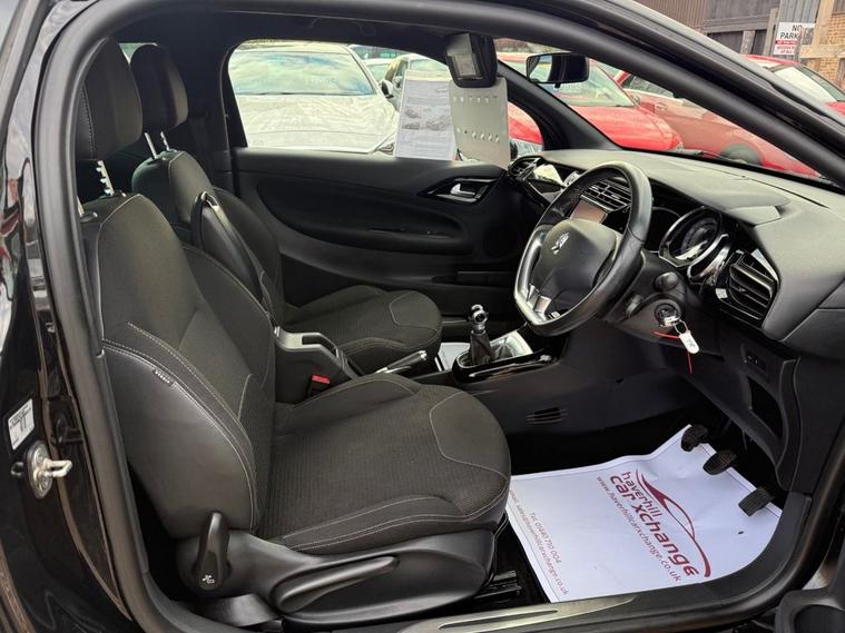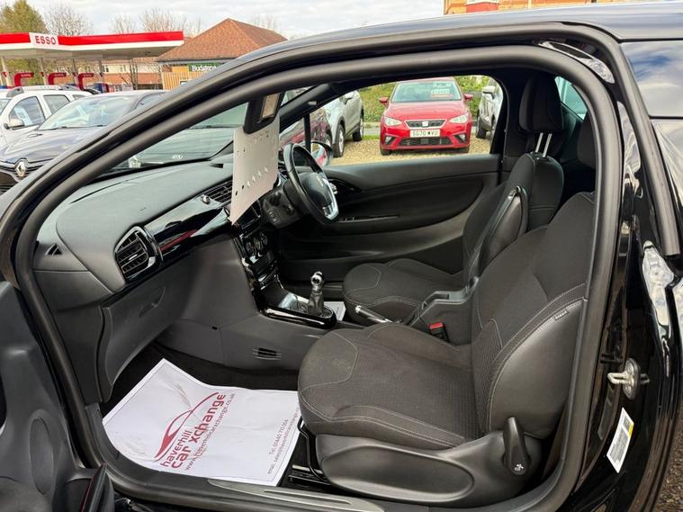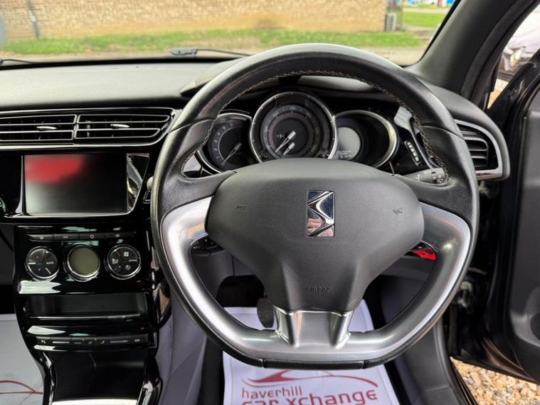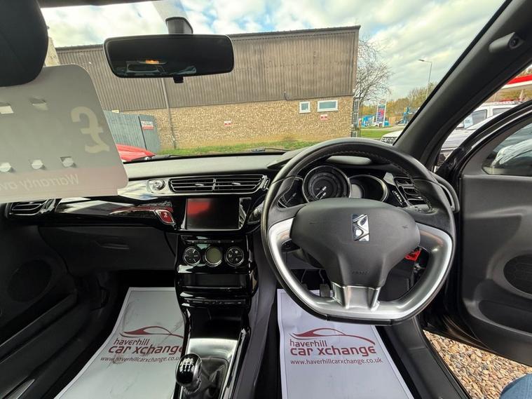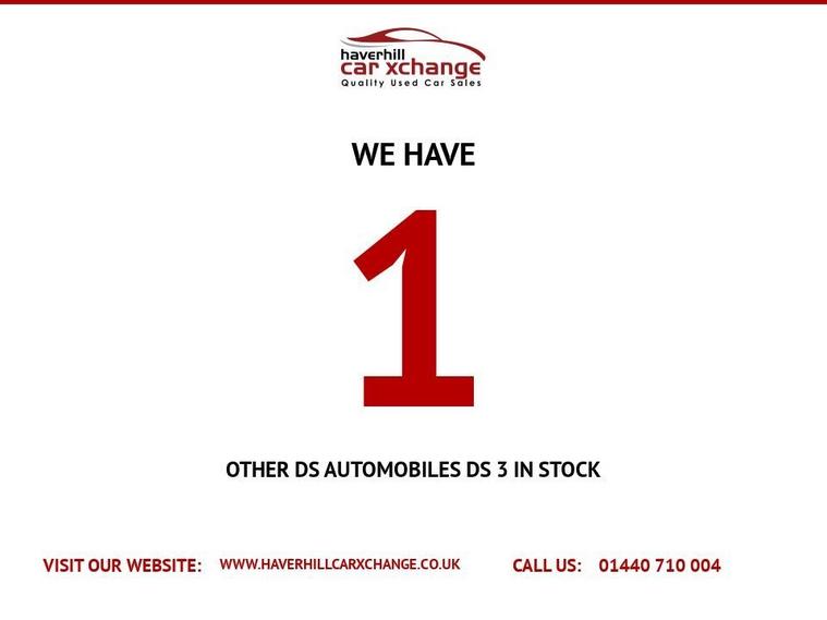 ONLY 57, 607 MILES+12 MONTHS MOT+7 INCH COLOUR TOUCHSCREEN SATELLITE NAVIGATION SYSTEM+DAB DIGITAL RADIO+BLUETOOTH HANDSFREE AND MEDIA STREAMING+AUTOMATIC AIR-CONDITIONING+CRUISE CONTROL+LED DAYTIME RUNNING LIGHTS+PARKING ASSISTANCE+PERLA NERA BLACK PAINT+17 INCH ALLOY WHEELS. At Haverhill Car Xchange we would like to offer you our LOW MILEAGE Citroen DS 3 PureTech Connected Chic Hatchback which has been finished in a Perla Nera Black paint with Basalt Black Rayados Cloth upholstery. Specification Includes a 7 Inch Colour Touchscreen which features a Satellite Navigation System, Mirror Screen with Mirror Link and Car Play, DAB Digital Radio, Bluetooth Handsfree and Media Streaming with USB Socket, AUX Socket, 12 Volt Power Socket, DS Connect Box and Assistance System, Automatic Air-Conditioning, Cruise Control with Speed Limiter, Gear Efficiency Indicator, Front Electric Windows, Body Coloured Bumpers/Door Handles and Door Mirrors, Satin Chrome Door Sill Protectors, LED Daytime Running Lights, LED Front Fog Lights, Interior Mood Lighting, Parking Assistance, Dark Tinted Rear Windows, 17 Inch Alloy Wheels, Variable Power-Assisted Steering, ABS Breaking System, Airbags, Alarm, Immobiliser, Remote Central Locking and ISOFIX Anchorage Points for Child Seats.
