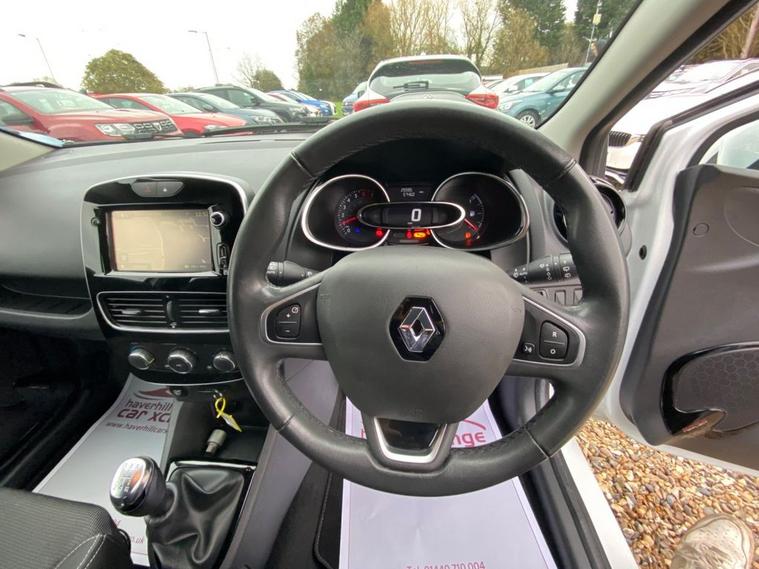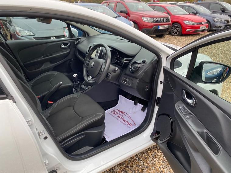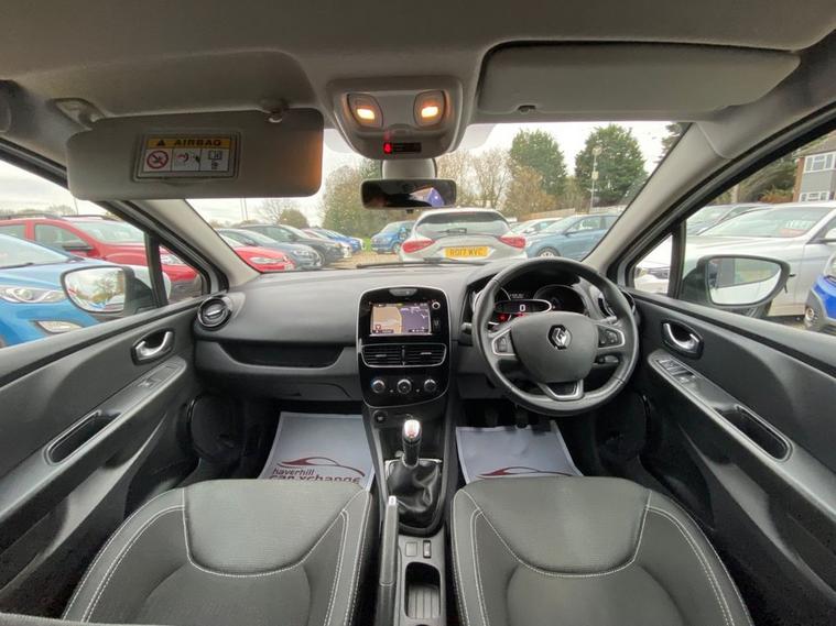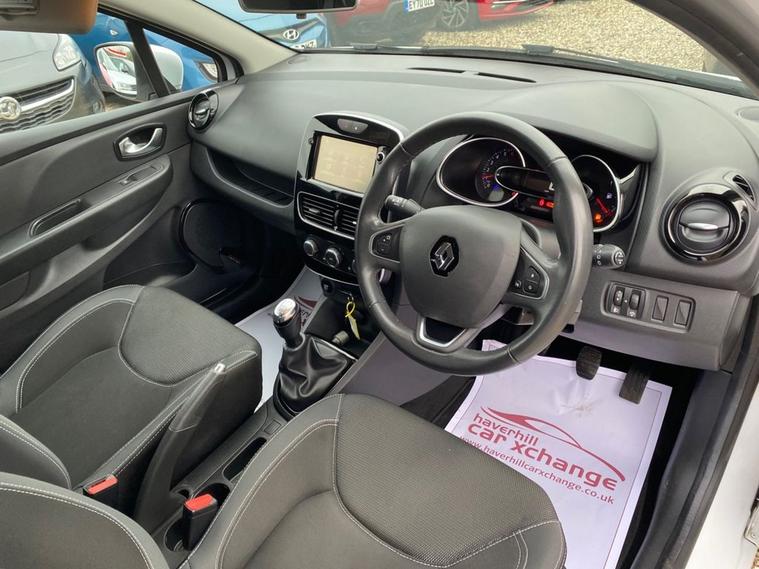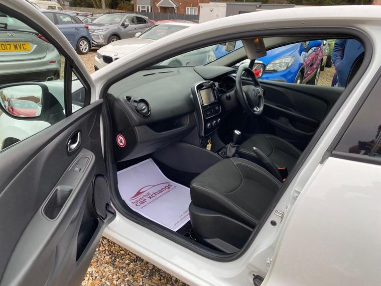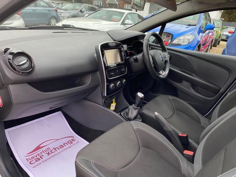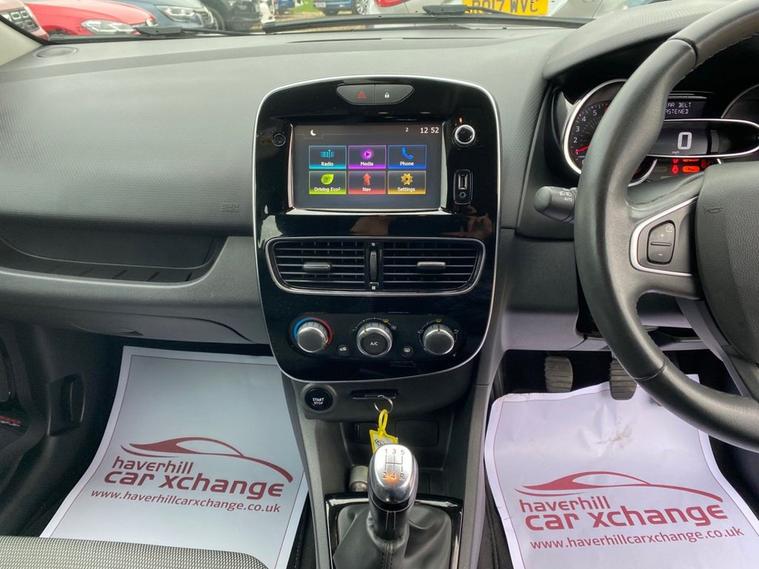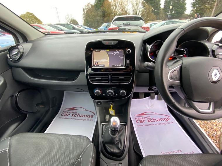ONLY 25, 593 MILES+EXCELLENT SERVICE HISTORY+12 MONTHS MOT+RENAULT MEDIA NAV+AIR-CONDITIONING+AUTOMATIC HEADLIGHT ACTIVATION+RAIN-SENSING WINDSCREEN WIPERS+GLACIER WHITE PAINT+16 INCH ALLOY WHEELS. At Haverhill Car Xchange we would like to offer you our EXTREMELY LOW MILEAGE Renault Clio Dynamique Nav Hatchback which has been finished in a Glacier White paint, Dark Carbon with Mesh Inserts and Grey Piping. Specification Includes a Renault MediaNav System, USB Socket, Jack, 12 Volt Power Socket, Air-Conditioning, Gear Change Indicator, Cruise Control with Speed Limiter, Front Electric Windows, Body Coloured Bumpers/Door Handles, Rear Roof Spoiler and Door Mirrors with Integrated Side Indicators, Automatic Headlight Activation, LED Daytime Running Lights, Double Optic Halogen Headlights, Front Fog Lights, Rain-Sensing Windscreen Wipers, Steering WSheel, Handsfree Keycard with Push Button Start-Stop Function, 16 Inch Alloy Wheels, Power Assisted Steering, Hill Start Assist, ABS Breaking System, Alarm, Immobiliser, Remote Central Locking and ISOFIX Anchorage Points for Child Seats.