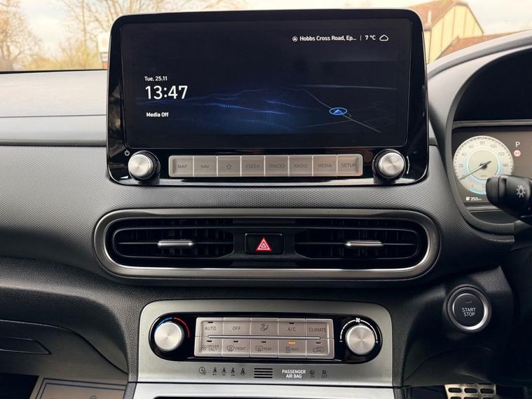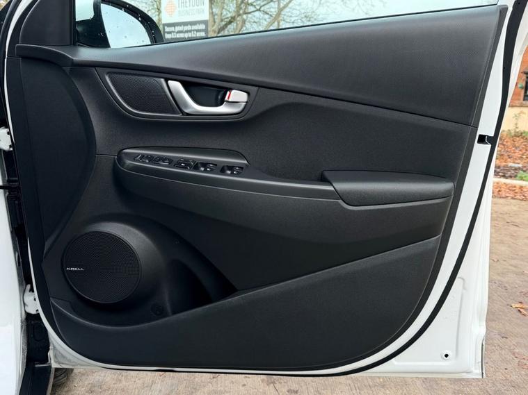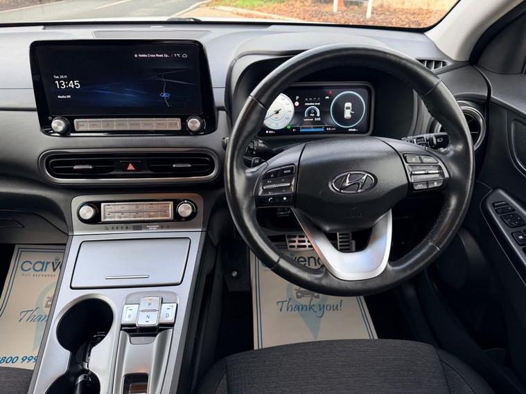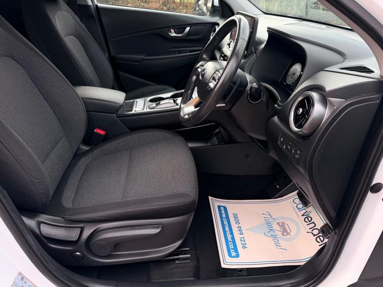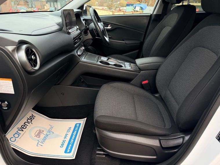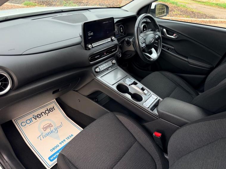 At Carvender we are presenting the stunning all-electric 2021 Hyundai Kona 64kWh Premium 5dr. This Hyundai Kona is a top-tier compact SUV designed for modern living. This Hyundai Kona is powered by a 204 Brake Horse Power (BHP) motor and offers eco-friendly seamless blend of efficiency, style and cutting-edge technology. The Hyundai Kona is equipped with a 64kWh battery which delivers a range of up to 300 miles in single charge by books. This Hyundai Kona is in eye-catching colour which features full LED headlights and sleek body lines for a sophisticated look. This Hyundai Kona is equipped with luxurious cabin with premium materials and modern features including Cruise Control, Lane Keeping Assist, Reversing Camera, Rear & Front Parking Sensors, Heated Seats, Heated Steering, SatNav, Apple CarPlay/Android Auto, Mobile Connection and much more. We have Full Hyundai Main Dealer Service History which have been carried out at mileages of 11609, 27607, 38509 and 49350 on 17/10/2025. Contact us today to schedule a test drive or visit our website for home delivery with 14 days money back guaranty and enjoy the future of driving with zero emissions, a refined ride and high-end comfort.