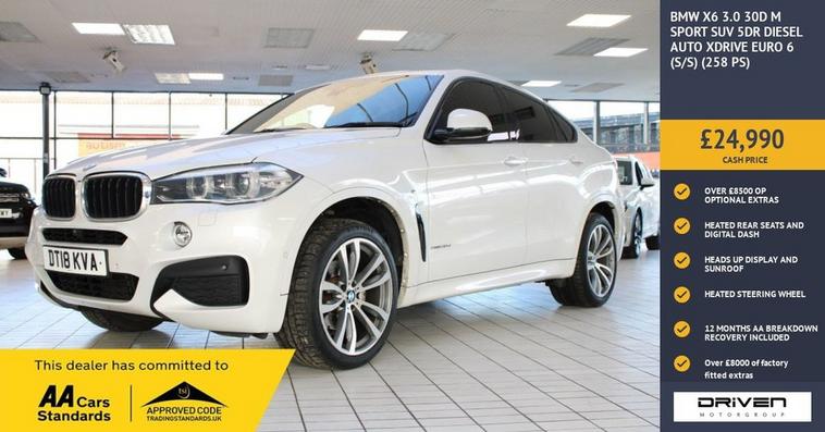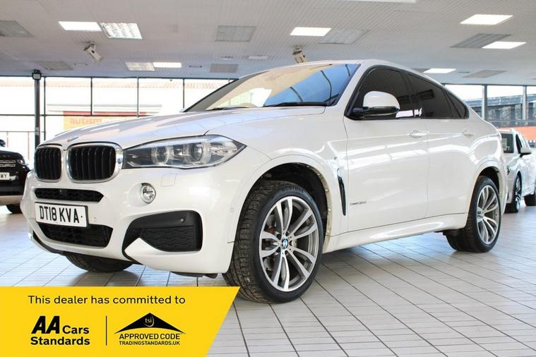 BMW X6 3.0 30D M SPORT SUV 5DR DIESEL AUTO XDRIVE FINISHED IN MINERAL WHITE AND COMPLIMENTED WITH DAKOTA BLACK LEATHER INTERIOR, THIS VEHICLE HAS BEEN VERY WELL CARED FOR AND MAINTAINED PLUS COMPREHENSIVE PRE DELIVERY HEALTH CHECK AND SERVICE COMPLETED PRIOR TO SALE AT 48194 MILES. KEY FEATURES INCLUDE OVER £8500 WORTH OF OPTIONAL EXTRAS INCLUDING ELECTRIC GLASS SUNROOF, SUN PROTECTING GLAZING, M-SPORT PLUS PACK, FOUR ZONE AIR CONDITIONING, DIGITAL COCKPIT, COLD WEATHER PACK, HEATED STEERING WHEEL, HEATED REAR SEATS, SPEED LIMIT DISPLAY, HARMON KARDEN SOUND SYSTEM, PARK ASSIST, HEADS UP DISPLAY, SURROUND VIEW, OTHER KEY FEATURES INCLUDE ALLOY WHEELS, ALARM, IMMOBILISER, AUTO REAR DIMMING REAR VIEW MIRROR, BLUETOOTH WITH HANDSFREE WITH USB AUDIO, BMW PROFESSIONAL RADIO WITH CD PLAYER, DAB RADIO, FOLDING DOOR MIRRORS WITH AUTODIM, FRONT AND REAR PARK ASSIST WITH REAR VIEW CAMERA, AUTOMATIC HEADLIGHTS, DRIVER SEAT MEMORY, POWERED TAILGATE, VOICE CONTROL, HEATED WASHER JETS PLUS MUCH MUCH MORE. COMMITTED TO AA CARS STANDARDS: 3 MONTHS OR 3000 MILES WARRANTY INCLUDED WITH AN OPTION TO UPGRADE: 12 MONTHS AA BREAKDOWN RECOVERY INCLUDED: £75.00 CONTRIBUTION TOWARDS YOUR NEXT SERVICE/MOT AT ANY AA CARS STANDARD APPROVED WORKSHOP: WE STAND BY THE QUALITY OF OUR VEHICLES. WITH THE PURCHASE OF THIS VEHICLE, YOU WILL RECEIVE 3 MONTHS OR 3000 WARRANTY, 12 MONTHS AA BREAKDOWN RECOVERY, GIVING YOU ADDITIONAL PEACE OF MIND AND PROTECTION. ALL OUR CARS COME WITH AT LEAST 6 MONTHS MOT AND PRE SALE HEALTH CHECK AND ROAD TEST. OUR PROFESSIONAL TEAM ENSURES YOUR VEHICLE STAYS IN TOP CONDITION, AND YOU ENJOY A HASSLE-FREE OWNERSHIP EXPERIENCE. 4.6 STARS ON GOOGLE WITH OVER 550 REVIEWS: JOIN OUR COMMUNITY OF SATISFIED CUSTOMERS! OUR DEALERSHIP IS PROUD TO HAVE A 4.6 STAR RATING ON GOOGLE, BACKED BY OVER 550 POSITIVE REVIEWS. WE ARE COMMITTED TO PROVIDING EXCELLENT SERVICE AND HIGH-QUALITY VEHICLES. This Vehicle Comes Equipped with High Specification, Which Includes: -