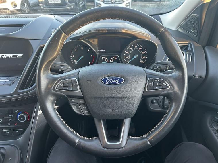 This 2018 Ford Kuga TDCi Vignale offers a clear vehicle history, providing peace of mind for its next owner. This Four Wheel Drive model is powered by a 2.0 litre diesel engine and meets Euro 6 emission standards. It comes equipped with a premium Ford DAB Navigation System featuring Ford SYNC3, which includes Bluetooth connectivity and rear parking assistance with a camera. Youll also appreciate the convenience of Keyless Opening with a Hands Free Power Tailgate, allowing for effortless access. Further enhancing this Kuga Vignale are Bi-Xenon headlights with dynamic bending adaptive beam shape, ensuring excellent visibility in all conditions. The Dual-Zone Electronic Automatic Temperature Control provides individual climate settings for driver and passenger. These features, combined with its low CO2 emissions for its class, demonstrate a superior level of specification and efficiency compared to other vehicles.