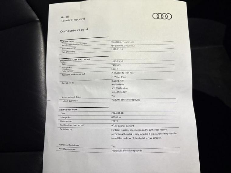 This 2020 Audi Q7 TFSIe V6 S line boasts a single owner and a clear vehicle history check, offering peace of mind. As a Euro 6 compliant model, it features a powerful 3.0 litre petrol plug-in hybrid engine paired with Audis renowned Four Wheel Drive system, ensuring excellent performance and efficiency. This S line trim level comes equipped with a Type 2 Mode 3 charging cable and a Type 2 socket for AC charging, alongside a domestic 3 pin 10 amp charging cable. For comfort, it includes 3 Zone Electronic Climate Control, and an Acoustic Vehicle Warning System is fitted for pedestrian safety. With an MOT valid until October 2026 and a substantial towing weight of 2700 kg, this Q7 is ready for any adventure. Experience the impressive acceleration of this Audi Q7, reaching 0-60mph in just 5.9 seconds, a figure that highlights its dynamic capability compared to many other vehicles in its class. This plug-in hybrid technology offers a compelling blend of electric driving for shorter journeys and the flexibility of a petrol engine for longer trips. The combination of its advanced drivetrain, luxurious S line trim, and comprehensive charging solutions makes this Q7 a sophisticated and capable choice for discerning drivers.