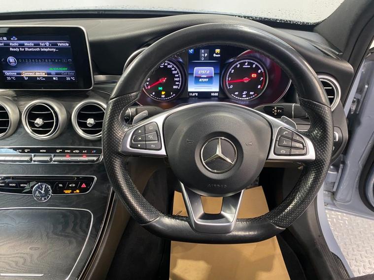 When it comes to a rock-solid premium image, theres little to beat a Mercedes. This sleek and sporty C Class looks sublime in Diamond Silver metallic complete with 18 AMG alloy wheels, AMG bodystyling and a huge twin panel panoramic electric sunroof. The solid 2.0 petrol engine provides a huge 181 Bhp yet remains an economical choice with Mercedes suggesting up to 58 mpg achievable on an extended journey. Driving this car is a dream thanks to the silky smooth 9 speed automatic transmission and the level of equipment is seriously impressive. The full Carbon leather upholstery is supremely comfortable and easy to keep clean - both front seats are electrically adjustable and have 3-stage heating. Theres also a cruise control, COMAND with Navigation and voice recognition, Bluetooth connectivity, front & rear parking sensors + camera, dual zone climate control and more ! For the year of manufacture the mileage is very sensible at just over 87, 000 and this is backed up with detailed service history and reflected in the cars outstanding condition.