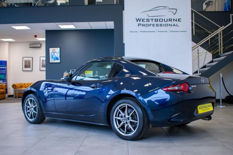 2022 72 Mzda MX-5 RF 1.5 SKYACTIV-G Sport, finished in Deep Crystal Blue with Black Perforated Leather interior. Fabulous specification includes Heated Seats, 7-inch Touchscreen Multimedia System with Satellite Navigation, Apple CarPlay / Android Auto, DAB Radio, Bluetooth Connectivity, BOSE Sound System, Rear Parking Sensors, Air Conditioning, Cruise Control, Automatic LED Headlights, Lane Departure Warning System, Tyre Pressure Monitoring System, Keyless Entry & Start and more. A one owner example complete with full Mazda service history carried out on 05/09/2023 at 4899 miles, 03/09/2024 at 8816 miles and 12/09/2025 at 11592 miles.