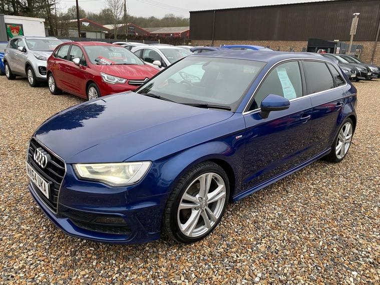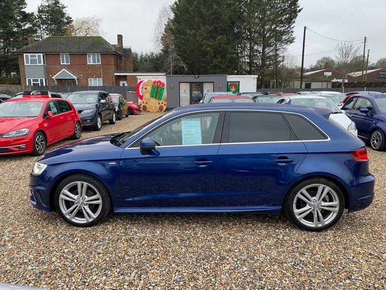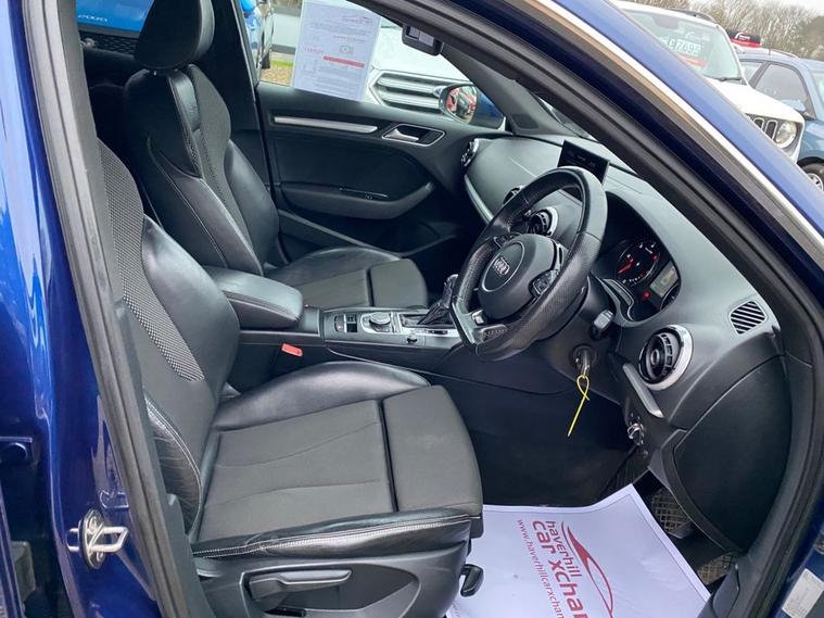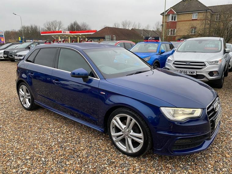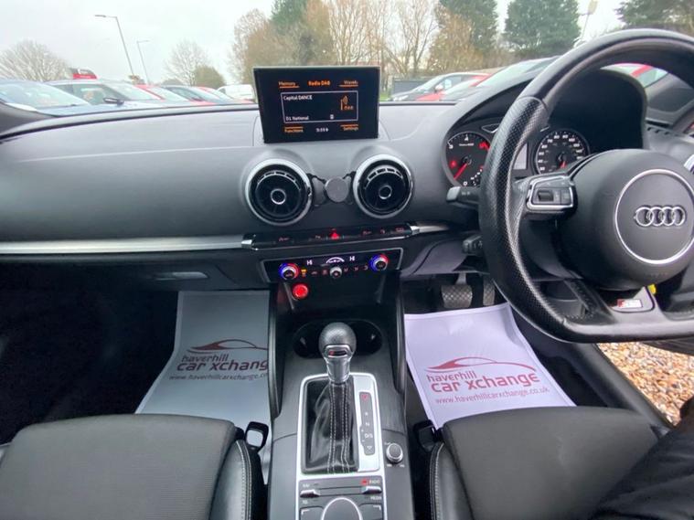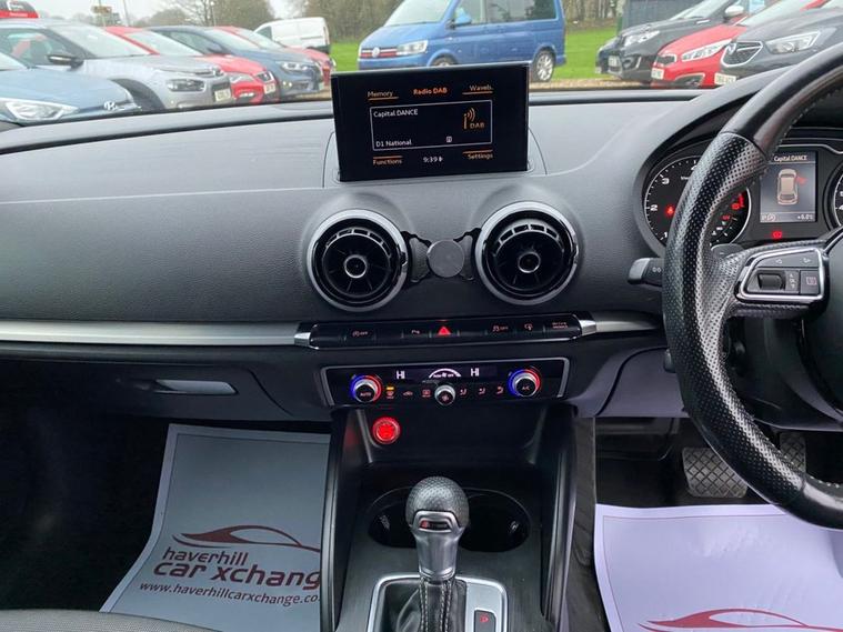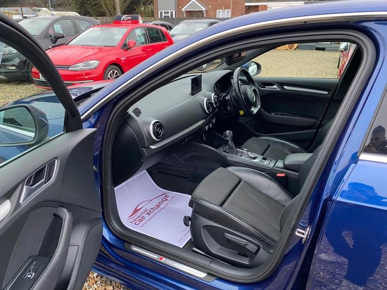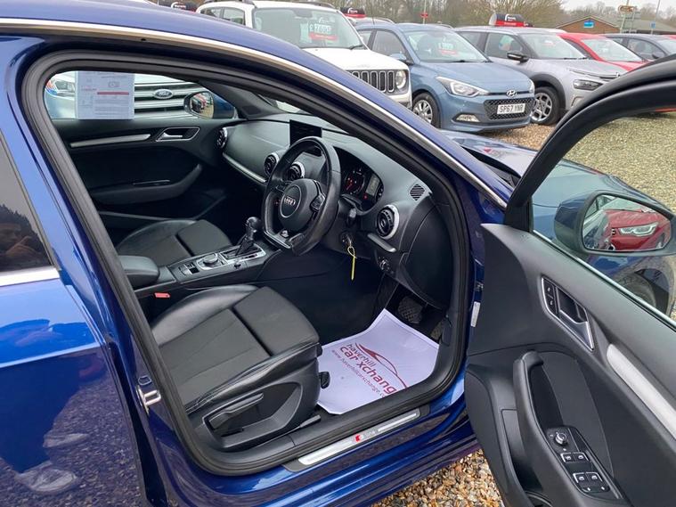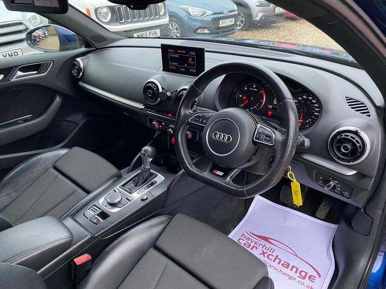 AUTOMATIC+£20 A YEAR ROAD TAX+HALF LEATHER AND CLOTH UPHOLSTERY+DAB DIGITAL RADIO+BLUETOOTH INTERFACE+DUAL ZONE CLIMATE CONTROL AIR-CONDITIONING+BI-XENON HEADLIGHTS+FRONT SPORTS SEATS+SCUBA BLUE PAINT+18 INCH ALLOY WHEELS. At Haverhill Car Xchange we would like to offer you our Audi A3 S-Line Sportback which has been finished in a Scuba Blue paint with Black half Nappa Leather and Biathion Cloth upholstery. Specification Includes an Audi Music Interface, DAB Digital Radio, Bluetooth Telephone Interface, USB Connection, 12 Volt Power Socket in Centre Console and Rear, Dual Zone Climate Control Air-Conditioning, Audi Drive Select, Front and Rear Electric Windows, Body Coloured Bumpers/Door Handles and Door Mirrors-Electrically Adjustable and Heated, Front Sports Seats, S-Line Design Front and Rear Bumpers, S-Line Badges on Front Wings, S-Line Body Styling Side Grilles and Diffusers in Platinum Grey, Black High Gloss Radiator Grille, Bi-Xenon Headlights, Daytime Running Lights, Front Fog Lights with High Gloss Black Surrounds, Multifunction Steering Wheel, 18 Inch Alloy Wheels, Power Steering, ABS Breaking System, Airbags, Alarm, Immobiliser, Remote Central Locking and ISOFIX Anchorage Points for Child Seats.