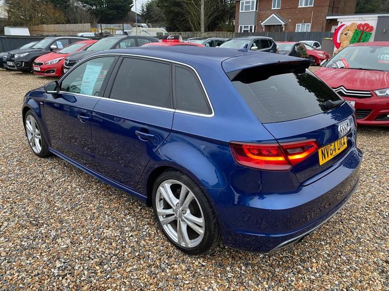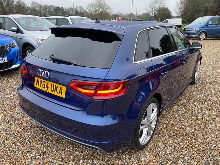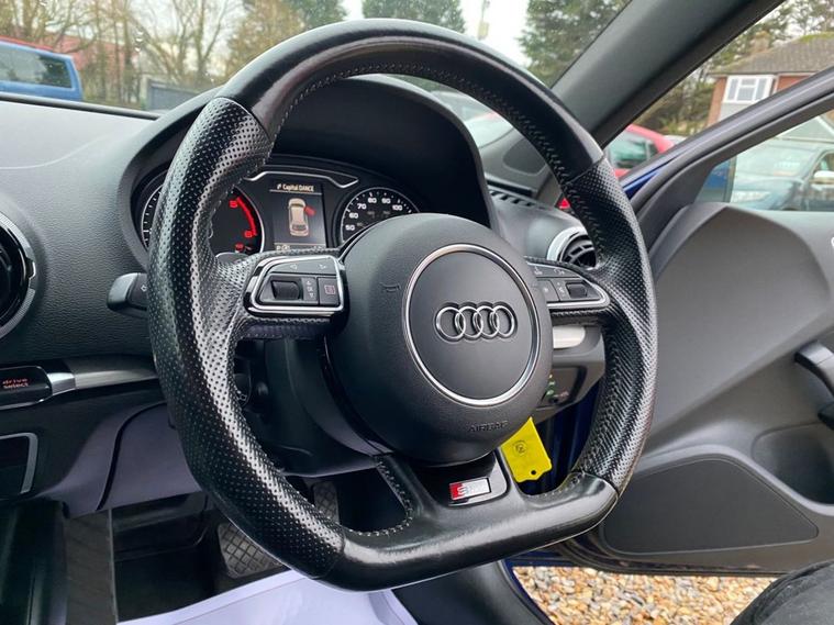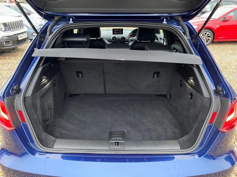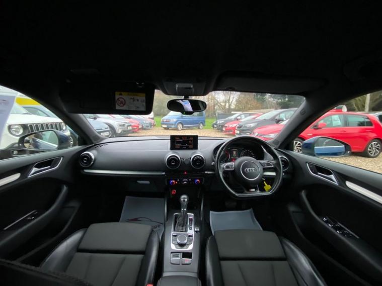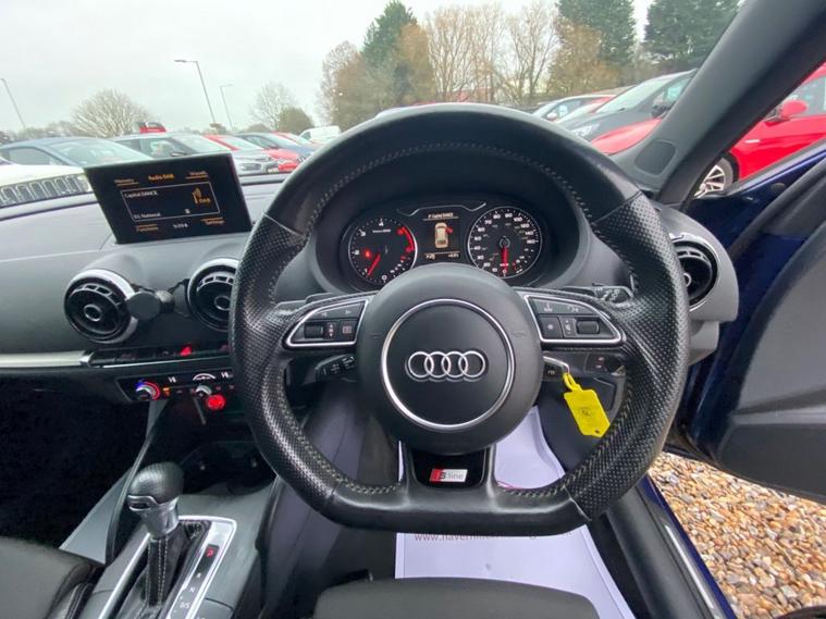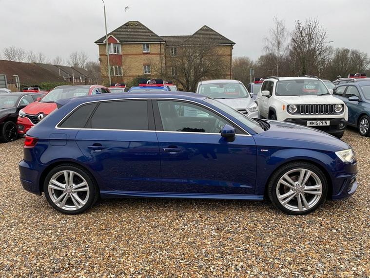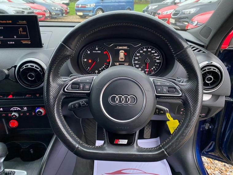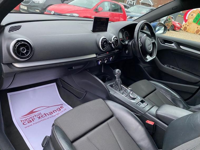 AUTOMATIC+£20 A YEAR ROAD TAX+HALF LEATHER AND CLOTH UPHOLSTERY+DAB DIGITAL RADIO+BLUETOOTH INTERFACE+DUAL ZONE CLIMATE CONTROL AIR-CONDITIONING+BI-XENON HEADLIGHTS+FRONT SPORTS SEATS+SCUBA BLUE PAINT+18 INCH ALLOY WHEELS. At Haverhill Car Xchange we would like to offer you our Audi A3 S-Line Sportback which has been finished in a Scuba Blue paint with Black half Nappa Leather and Biathion Cloth upholstery. Specification Includes an Audi Music Interface, DAB Digital Radio, Bluetooth Telephone Interface, USB Connection, 12 Volt Power Socket in Centre Console and Rear, Dual Zone Climate Control Air-Conditioning, Audi Drive Select, Front and Rear Electric Windows, Body Coloured Bumpers/Door Handles and Door Mirrors-Electrically Adjustable and Heated, Front Sports Seats, S-Line Design Front and Rear Bumpers, S-Line Badges on Front Wings, S-Line Body Styling Side Grilles and Diffusers in Platinum Grey, Black High Gloss Radiator Grille, Bi-Xenon Headlights, Daytime Running Lights, Front Fog Lights with High Gloss Black Surrounds, Multifunction Steering Wheel, 18 Inch Alloy Wheels, Power Steering, ABS Breaking System, Airbags, Alarm, Immobiliser, Remote Central Locking and ISOFIX Anchorage Points for Child Seats.