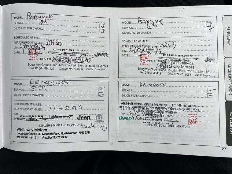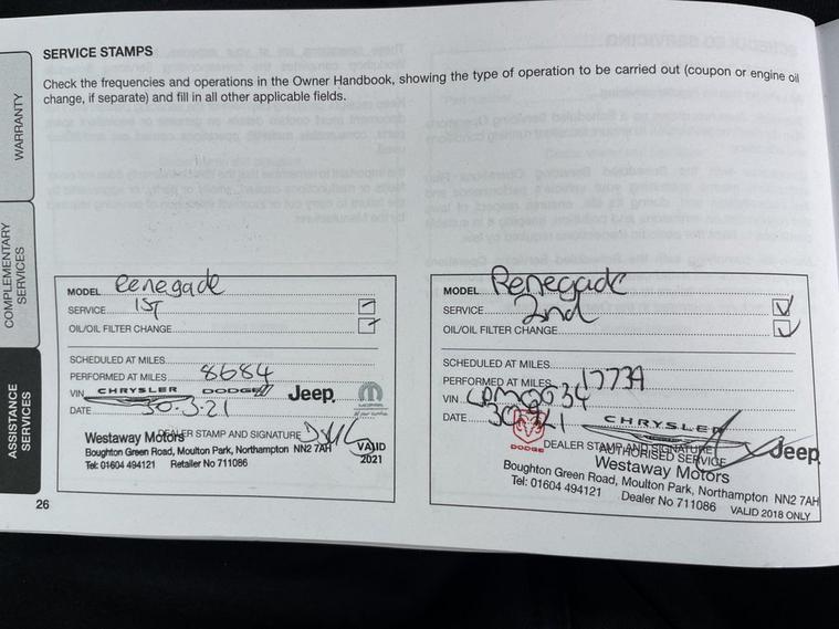 This 2020 Jeep Renegade GSE T4 S offers peace of mind with a clear vehicle history check and an MOT valid until October 2026. This Four Wheel Drive model is powered by a 1.3 litre Euro 6 petrol engine, making it a capable and compliant choice. Inside, youll find a wealth of technology designed for convenience and safety, including a Parking Pack with Blind Spot Assistance and a rear camera, plus automatic headlights as part of the Visibility Pack. The cabin also features steering wheel controls with Bluetooth connectivity, allowing for seamless integration with your devices, and the Reversible and Height Adjustable Cargo Load Floor adds practicality for any journey. Experience the responsive performance of this Renegade, which accelerates from 0 to 60mph in just 8.5 seconds, demonstrating its agility on the road. This impressive acceleration, combined with its Four Wheel Drive capability and comprehensive feature set including Apple CarPlay and Android Auto, sets this Jeep Renegade apart from other vehicles in its class. It is a well equipped and thoroughly checked example ready for its next adventure.