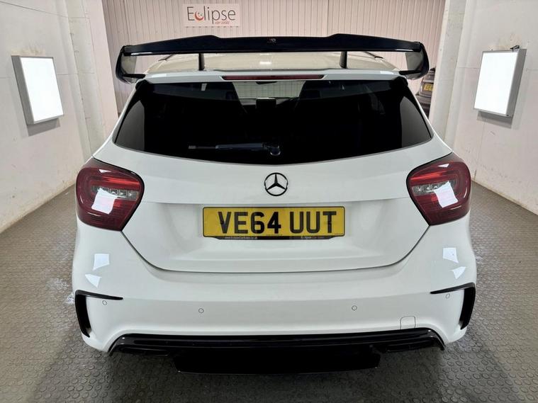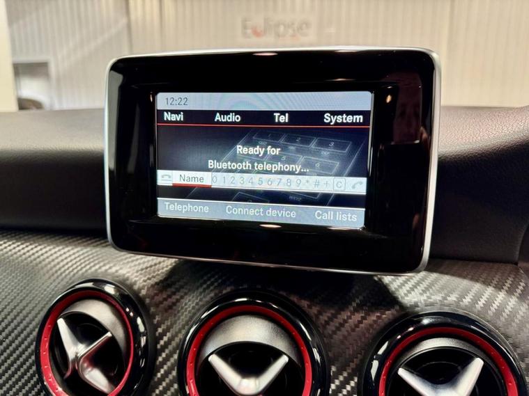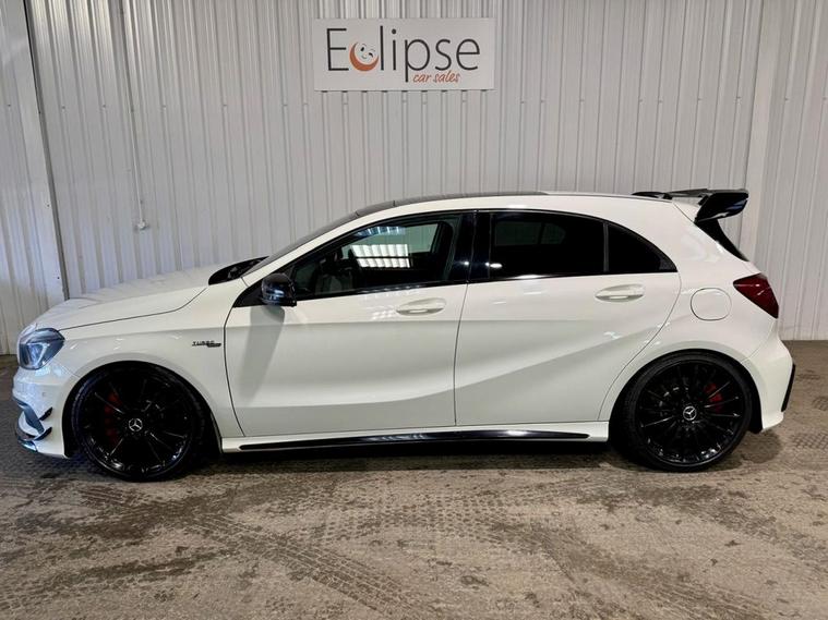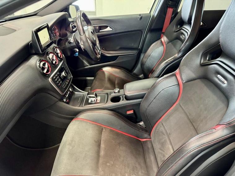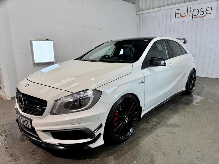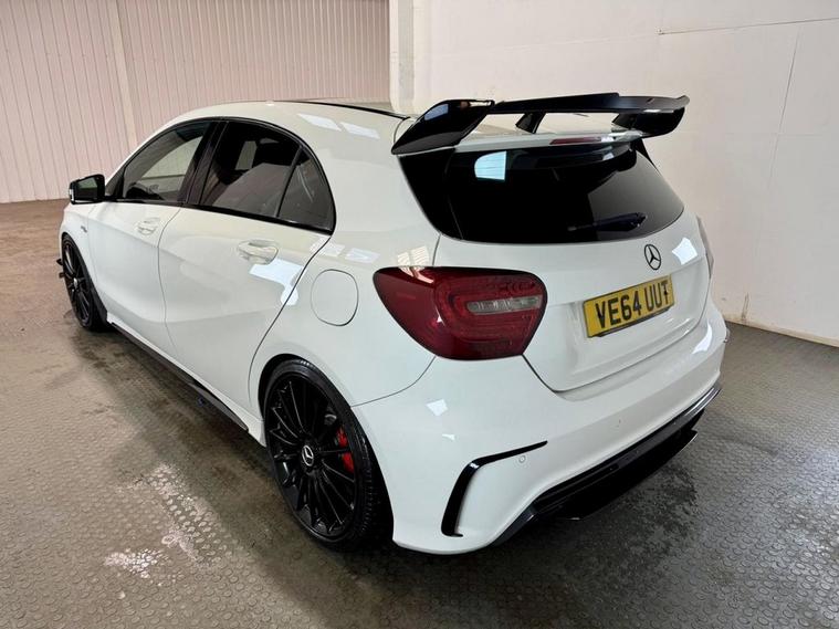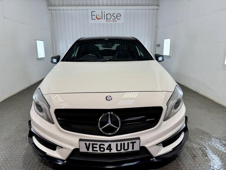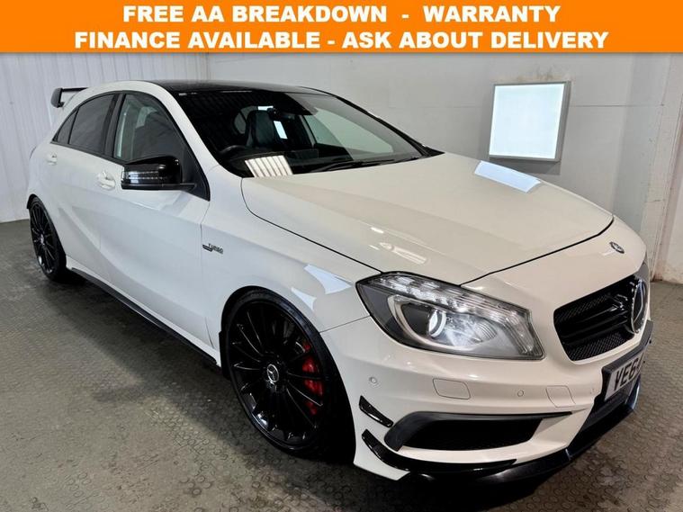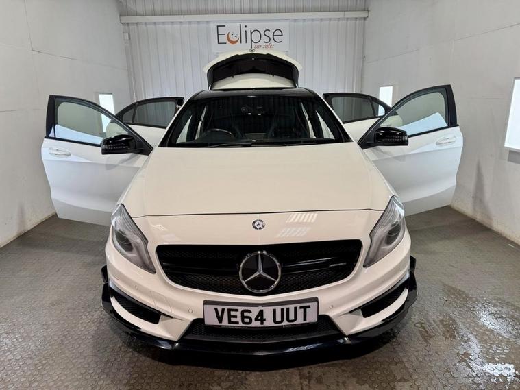 **THIS VEHICLE MAY BE AT OUR 150-CAR STORAGE FACILITY. PLEASE CALL AHEAD TO ARRANGE VIEWING AT OUR WINCHESTER SALES SITE** Mercedes-Benz A45 AMG first registered in December 2014 (64 reg) Finished in Calcite white with a black leather and microfiber interior and 19 inch alloy wheels. Spec includes panoramic sunroof, dual zone climate control, In built sat nav, Bluetooth connectivity, Red AMG Callipers, Adaptive full beam headlights, Electric front memory seats, red seatbelts, AMG multifunction performance steering wheel.