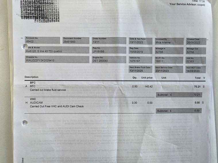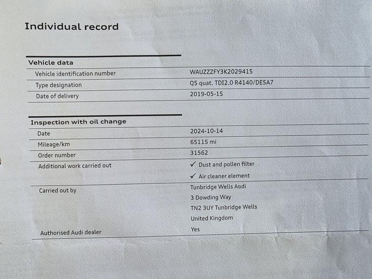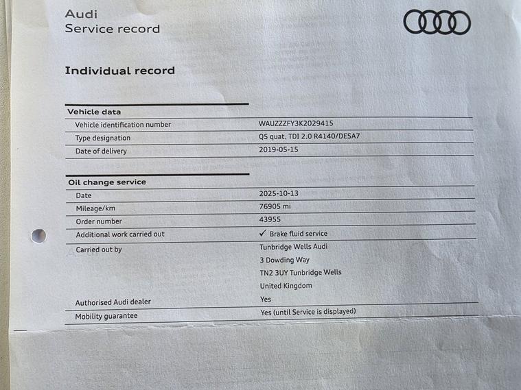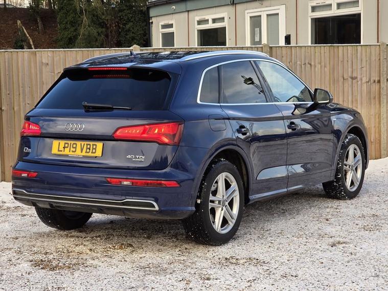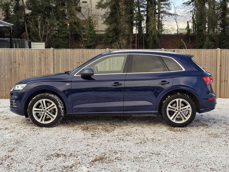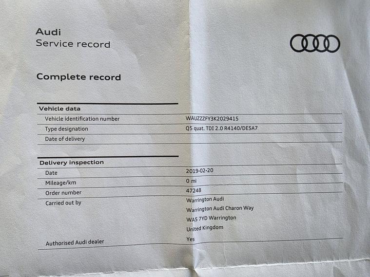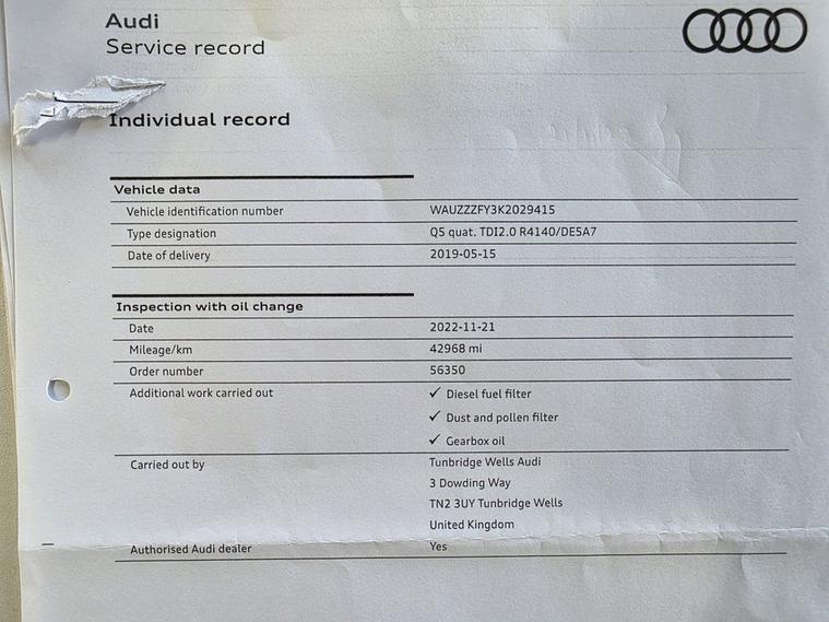 This 2019 Audi Q5 TDI S line offers peace of mind with a clear vehicle history check and MOT valid until May 2026. This four wheel drive model features a 2.0 litre diesel engine and meets Euro 6 emissions standards. Notable features include LED headlights and rear lights with dynamic rear indicators, the Audi Parking System Plus with front and rear sensors, and a light and rain sensor for automatic headlight activation. Inside, you will find heated front seats for added comfort and a Bluetooth interface for seamless connectivity. The performance of this Q5 is highlighted by its impressive 0-60mph acceleration in just 8.1 seconds, demonstrating its capability. These specifications indicate how this vehicle offers a superior driving experience compared to other similar models on the market.