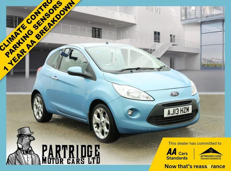 HPI CLEAR, SUPPLIED WITH NEW MOT, SUPPLIED WITH NEW SERVICE, CLIMATE CONTROL, PARKING SENSORS, ALLOY WHEELS, LOW MILEAGE, ELECTRIC WINDOWS, RADIO CD PLAYER, 3 DOOR, MANUAL, 3 MONTHS WARRANTY, 1 YEAR AA BREAKDOWN, AA DEALER **2013 Ford Ka 1.2 Titanium S/S: Top Spec, Low Mileage, Scuba Blue! AA Approved!** ******** A stunning example of the Ford Ka in the absolute top-of-the-range Titanium specification. Finished in the vibrant and highly sought-after **Scuba Blue** metallic, this 3-door hatchback is a cut above the rest. It boasts **Low Mileage** for its year, ensuring it has plenty of life left in it. As a Titanium model, it is packed with premium features rarely found in city cars, including **Climate Control** and **Parking Sensors**, making every journey comfortable and stress-free. Powered by the economical 1.2L engine with **Start/Stop (S/S)** technology, it offers incredible fuel efficiency and low road tax (£35/year). ******** **Key Features:** *** **Titanium Top Specification**: The flagship trim level, offering the highest level of luxury and equipment available on the Ka. *** **Automatic Climate Control**: A premium feature that automatically maintains your desired cabin temperaturea rare find in this class. *** **Rear Parking Sensors**: Takes the stress out of parking this compact car, protecting your paintwork. *** **Start/Stop Technology**: helps to reduce fuel consumption and emissions when stationary, lowering running costs. *** **Low Mileage**: A lightly used example that has been well-preserved. *** **Scuba Blue Metallic**: A fun, bright colour that suits the car perfectly. *** **Cheap Road Tax**: Just £35 per year thanks to the efficient engine. ******** **Buy with Confidence:** *** **HPI Clear**: Verified history check for your peace of mind. *** **Supplied with a New Service**: Freshly prepared by our expert mechanics. *** **Supplied with a New 12-Month MOT**: A fresh MOT will be completed for the new owner. *** **3 Months Warranty**: A comprehensive warranty is included for reassurance. *** **1 Year Breakdown Cover**: Nationwide roadside assistance is included with your purchase. *** **AA Approved Dealer**: Purchase from a trusted dealership inspected to exacting AA standards. ******** **Partridge Motor Cars - Your Trusted AA Dealer:** At Partridge Motor Cars, we pride ourselves on our exceptional standards. Every vehicle undergoes a meticulous inspection and preparation process to ensure it meets our high expectations. Were 5-star rated for a reason! ******** **Interested in this Ford Ka?** *** Schedule a viewing and test drive today! Call Partridge Motor Cars at **01403485928** or visit our website at * dealer's website *** Finance Available: Drive away today with flexible financing options. *** Part Exchange Welcome: Trade in your old car for a great deal on this Ford Ka. ******** A top-spec, low-mileage city car with climate control and sensors. Fully prepared and ready for the road!