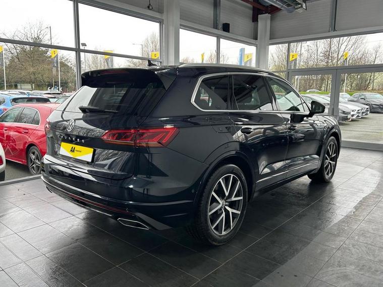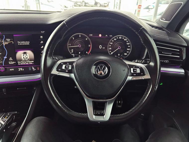 This 2019 Volkswagen Touareg TDI V6 R Line Tech boasts a FULL VW S/H + 2 FORMER OWNERS! , offering peace of mind for its next owner. This impressive four wheel drive SUV is powered by a robust 3.0 litre diesel engine, meeting Euro 6 emission standards. Its R Line Tech trim level ensures a premium experience, complemented by the striking Dynaudio Confidence High End Audio System for an exceptional sound experience. The Touareg R Line Tech is designed for both capability and performance. Its 3500 kg towing weight makes it a practical choice for a variety of needs, while the Off Road Pack and Driver Assistance Pack Plus provide added confidence and control in diverse driving conditions. Demonstrating its strong performance, this model achieves 0 to 60 miles per hour in a swift 6.3 seconds. Furthermore, its placement in a low insurance group highlights its cost effectiveness, making this Volkswagen Touareg a compelling option that stands out from similar vehicles.