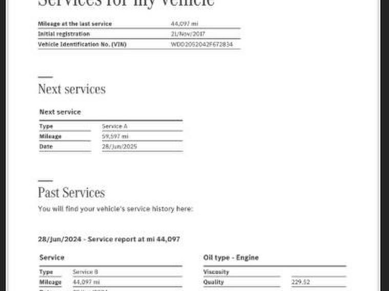 This 2017 Mercedes Benz C220d AMG Line boasts exceptionally low mileage for its age, having covered just 53, 539 miles. This Euro 6 compliant diesel model, presented in the desirable AMG Line trim, offers a clear vehicle history check for your peace of mind. Inside, youll find a wealth of features designed for comfort and convenience, including a Bluetooth interface for hands-free calls, a reversing camera paired with Active Parking Assist and front and rear parking sensors, and THERMATIC two zone automatic climate control. The front seats are also heated, ensuring a pleasant driving experience in all conditions. The C220d AMG Line stands out with its impressive fuel economy, achieving an excellent 60 miles per gallon, which is better than many similar vehicles. This efficiency is matched by strong performance, with the 2.1L diesel engine capable of accelerating from 0 to 60 miles per hour in just 7.5 seconds. These highlights demonstrate the superior blend of economy and power this Mercedes Benz offers.