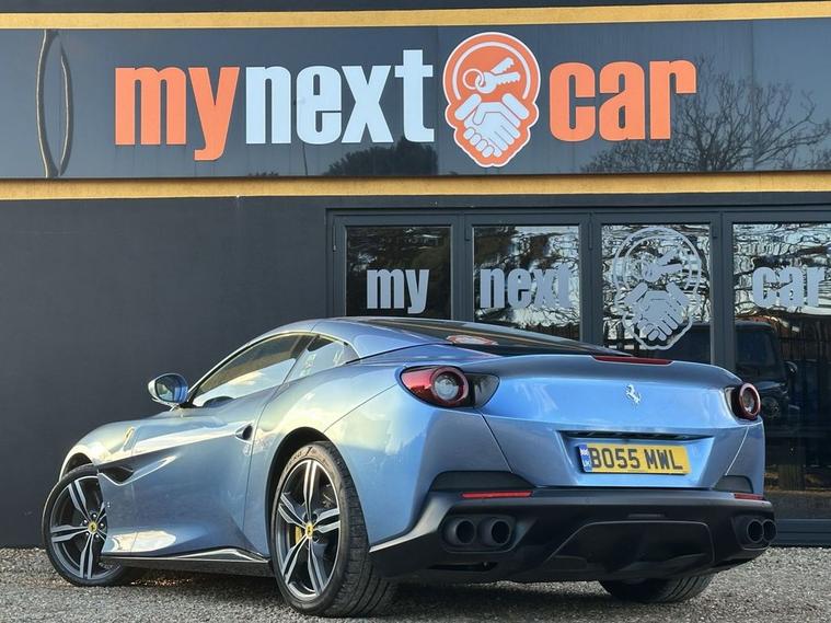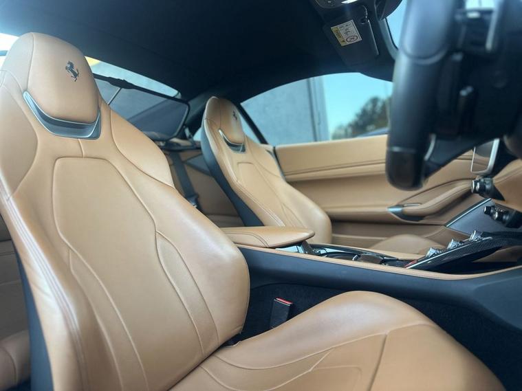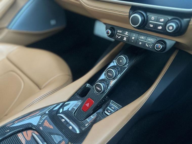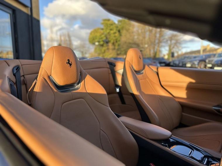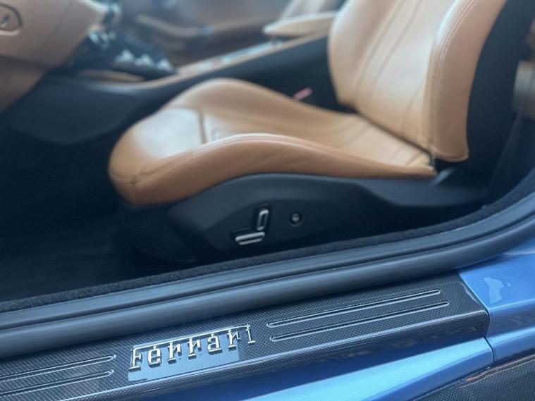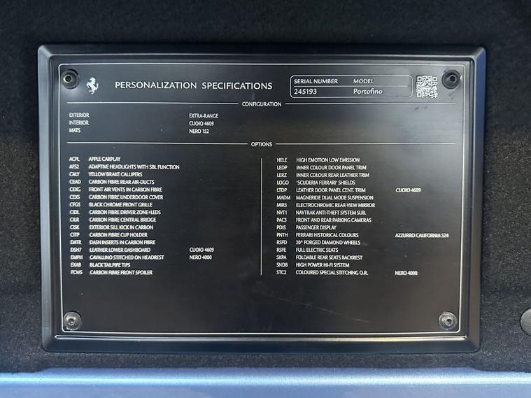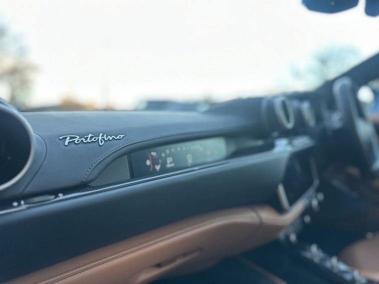 AZURE CALIFORNIA BLUE, Scuderia Wing Badges, 20 Forged Diamond Finished Alloys, Carbon Fibre Driver Zone With LEDS, Carbon Fibre Dashboard Inserts, Carbon Fibre Central Bridge, Carbon Fibre Cup Holder, Carbon Fibre Front Spoiler, Carbon Fibre Front Air Intakes, Carbon Fibre Sill Cover, Carbon Fibre Kick Plate, Carbon Fibre Rear Air Ducts, Yellow Brake Calipers, Black Chrome Front Grille, Black Ceramic Exhaust Pipes, Front & Rear Parking Cameras, Adaptive Front Headlights, Auto Dimming Mirrors, Magneride Suspension System, Contrast Stitching In Nero, Cavallino Logo Stitched Into Headrests, Full Electric Heated Seats, Apple CarPlay, JBL High Power HiFi, Passenger Display, Extended Leather In Cuoio, Carpets In Nero, Navtrak, Electronic Power Steering (EPS), Car cover set, Electric heated side mirrors with automatic closure, Electrochromic interior mirror, Full LED headlights, Instrument cluster with analogic RPM counter and double 5 TFT screen, LED tail lights, Rain and light sensors, Dual zone automatic air conditioning, Fold flat rear seat backrests, Full electric seats, Start button on steering wheel, ABS/EBD, Carbon-Ceramic brakes, Driver and passenger airbags, E-Diff (3rd generation), ESC (Electronic Stability Control), Side airbags on door panel for head protection, Traction control system, Anti theft system, Keyless Start, Battery maintainer