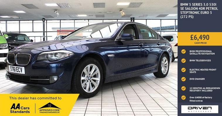 BMW 5 SERIES 3.0 530I SE SALOON 4DR PETROL STEPTRONIC FINISHED IN DEEP SEA BLUE AND COMPLIMENTED WITH OYSTER DAKOTA LEATHER INTERIOR, THIS VEHICLE HAS BEEN VERY WELL CARED FOR AND MAINTAINED WITH DOCUMENTED SERVICE HISTORY CARRIED OUT AT 17421, 32928, 41466, 44309, 55689, 67313, 86971 MILES PLUS COMPREHENSIVE PRE DELIVERY HEALTH CHECK AND SERVICE COMPLETED PRIOR TO SALE AT 92052 MILES. KEY FEATURES INCLUDE OVER £4000 OPTIONAL EXTRAS INCLUDING AUTOMATIC FOLDING HEATED DOOR MIRRORS, DVD CHANGER, BUSINESS ADVANCED MULTIMEDIA PACKAGE AND SATALLITE NAVIGATION, TELEPHONE VOICE CONTROL, OTHER KEY FEATURE INCLUDE ALARM, AMBIENT INTERIOR LIGHTING, AUTO DIMMING REAR VIEW MIRROR, BMW PROFESSIONAL SINGLE CD AND MP3 PLAYER, BMW TELESERVICES, CRUISE CONTROL WITH BRAKE FUNCTION, BLUJETOOTH, AUTOMATIC HEADLIGHTS, HEATED WASHER JETS, KEYLESS START, M-SPORT SUSPENSION, REAR PARKING DISTANCE CONTROL, ELECTRIC HEATED FRONT SEATS, USB AUDIO PLUS MUCH MORE. COMMITTED TO AA CARS STANDARDS: 3 MONTHS OR 3000 MILES WARRANTY INCLUDED WITH AN OPTION TO UPGRADE: 12 MONTHS AA BREAKDOWN RECOVERY INCLUDED: £75.00 CONTRIBUTION TOWARDS YOUR NEXT SERVICE/MOT AT ANY AA CARS STANDARD APPROVED WORKSHOP: WE STAND BY THE QUALITY OF OUR VEHICLES. WITH THE PURCHASE OF THIS VEHICLE, YOU WILL RECEIVE 3 MONTHS OR 3000 WARRANTY, 12 MONTHS AA BREAKDOWN RECOVERY, GIVING YOU ADDITIONAL PEACE OF MIND AND PROTECTION. ALL OUR CARS COME WITH AT LEAST 6 MONTHS MOT AND PRE SALE HEALTH CHECK AND ROAD TEST. OUR PROFESSIONAL TEAM ENSURES YOUR VEHICLE STAYS IN TOP CONDITION, AND YOU ENJOY A HASSLE-FREE OWNERSHIP EXPERIENCE. 4.7 STARS ON GOOGLE WITH OVER 550 REVIEWS: JOIN OUR COMMUNITY OF SATISFIED CUSTOMERS! OUR DEALERSHIP IS PROUD TO HAVE A 4.7 STAR RATING ON GOOGLE, BACKED BY OVER 550 POSITIVE REVIEWS. WE ARE COMMITTED TO PROVIDING EXCELLENT SERVICE AND HIGH-QUALITY VEHICLES. This Vehicle Comes Equipped with High Specification, Which Includes: -
