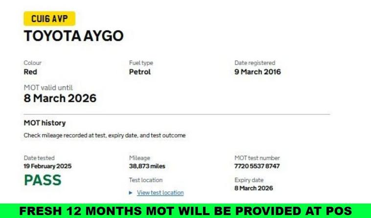 Visits by appointment please book in advance. Full Service History | 9 Services - 7 by TOYOTA | Only 2 Owners from Brand New | Set of 2 Keys | 12 Months MOT | Low Insurance Group: 07/50 | Cruise Control | Ulez Exempt | 3 Months Warranty with an optional upgrade to 6, 12 & 24 Months | Finance 1Available at 5.18% Fixed rate* - Decision within 30 mins | 12 Months Free AA Basic Breakdown Cover | Part Exchange Welcome | Last Service Carried out on 19/02/2025 at 38, 873 by TOYOTA | Traction Control | Air Conditioning | Automatic Gearbox | AUX/Bluetooth/USB Media Connectivity | AM/FM/DAB Radio | Handsfree Connectivity | Day Time Running lights | Front & Rear Heated Windscreen | Headlight Adjustment | Front Electric Windows | Multi-Function Steering Wheel Controls | Rear Folding Seats | Fully Adjustable Driver Seat | Front & Rear Fog Lights | HPI Clear | ISO Fix | Front Passenger Airbag | 15 Alloys | Tyre Inflator Kit - Present | Carpet Mats - Present. An excellent example of a Well Maintained Car. Reverse parking sensors - can be installed from £180 Competitive finance packages available, call now for a free no obligation quote! Nationwide delivery service available. Full walk around video available upon request. Part exchange is welcome, please call for a free valuation. Please read our 5 star reviews to ensure you are buying with confidence from a dealership that has been serving the country for years. Open 7 days a week. All External Finance Providers are Subject to a Finders Fee. There is no finders Fee for our in-house finance providers.