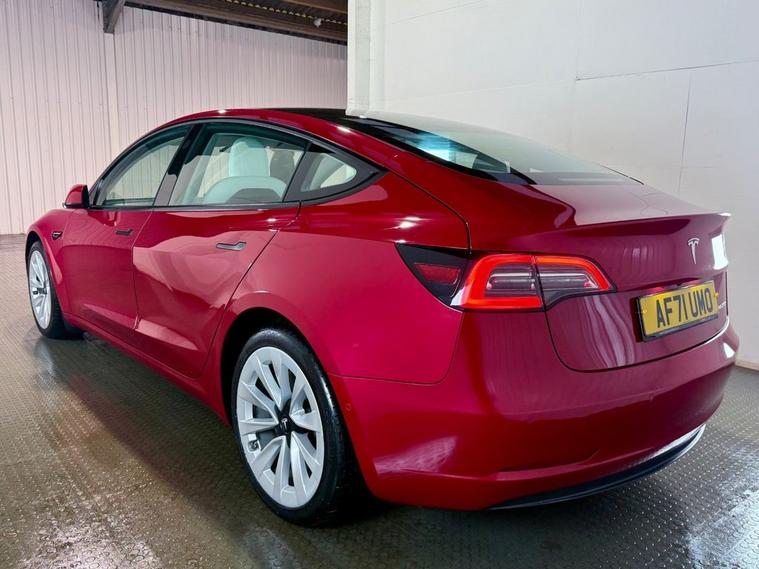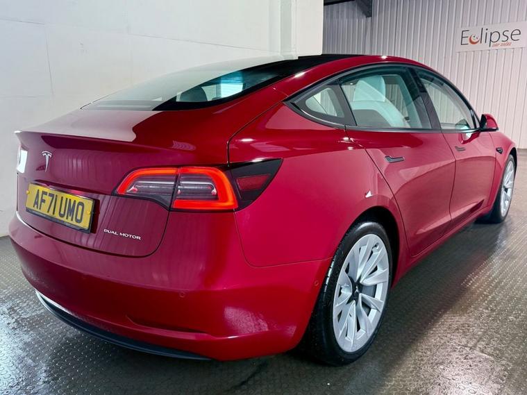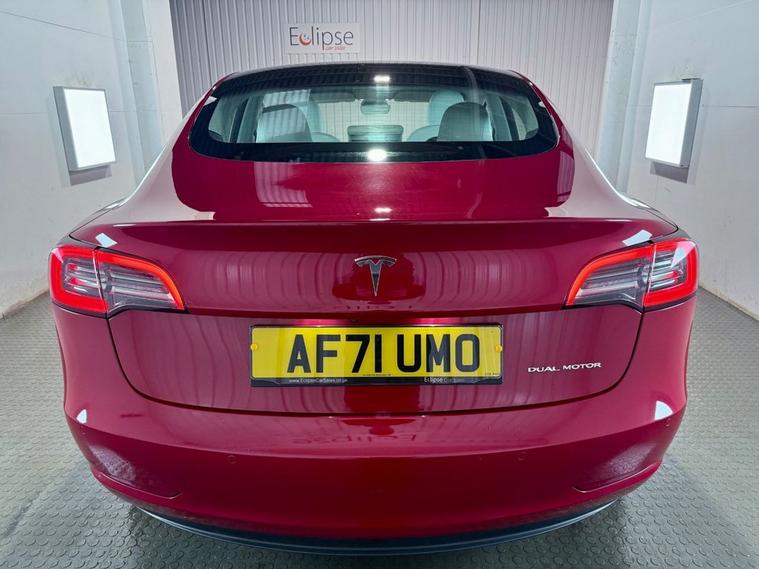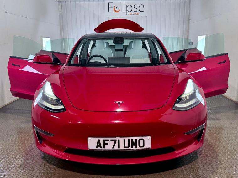 **THIS VEHICLE MAY BE AT OUR 150-CAR STORAGE FACILITY. PLEASE CALL AHEAD TO ARRANGE VIEWING AT OUR WINCHESTER SALES SITE** Tesla Model 3 Dual Motor long range Saloon first registered September 2021 (71 reg). Finished in Red Multi-Coat with a white leather interior and 19 inch Turbine Performance wheels. Spec includes heated front and rear seats | AutoPilot with Autosteer Beta | Google Maps Navigation | Reversing camera | Heated steering wheel | Powered Tailgate | Tinted Panoramic Roof | Front and Rear parking sensors.