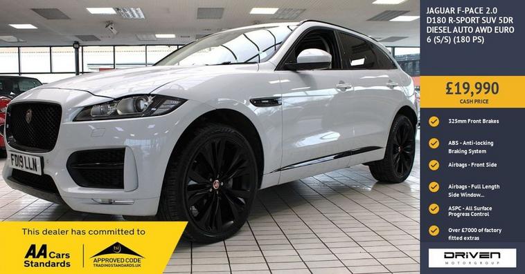 JAGUAR F-PACE 2.0 D180 R-SPORT SUV 5DR DIESEL AUTO AWD FINISHED IN YULONG WHITE AND COMPLIMENTED WITH BLACK LEATHER INTERIOR, THIS VEHICLE HAS BEEN VERY WELL CARED FOR AND MAINTAINED WITH DOCUMENTED SERVICE HISTORY CARRIED OUT AT 18442, 37201, 41285, 41604 MILES PLUS COMPREHENSIVE PRE DELIVERY HEALTH CHECK COMPLETED PRIOR TO SALE AT 42007 MILES. KEY FEATURES INCLUDE OVER £7000 WORTH OF OPTIONAL UPGRADES INCLUDING FIXED GLASS PANORAMIC ROOF, UPDRADED 22 INCH ALLOY WHEELS, AUTO DIMMING POWER FOLDING HEATED DOOR MIRRORS WITH APPROACH LIGHTS, PRIVACY GLASS, ILLUMINATED LOAD SPACE, HEATED STEERING WHEEL, INTERACTIVE DRIVER DISPLAY, PARK HEAT AND REMOTE CONTROL, AUTOMATIC HIGH BEAM ASSIST, OTHER KEY FEATURES INCLUDE AMBIENT LIGHTING, SMARTPHONE INTEGRATION, CONNECT PRO, CRUISE CONTROL WITH SPEED LIMITER, BLUETOOTH, DAB RADIO, FRONT AND REAR PARKING AID, GREEN TINTED GLASS, HEATED FRONT SEATS, JAGUAR COUND SYSTEM, POWERED TAILGATE, RAIN SENSITIVE WIPERS, REAR CAMERA, MULTIFUNCTIONAL STEERING WHEEL, VOICE CONTROL PLUS MUCH MORE. COMMITTED TO AA CARS STANDARDS: 3 MONTHS OR 3000 MILES WARRANTY INCLUDED WITH AN OPTION TO UPGRADE: 12 MONTHS AA BREAKDOWN RECOVERY INCLUDED: £75.00 CONTRIBUTION TOWARDS YOUR NEXT SERVICE/MOT AT ANY AA CARS STANDARD APPROVED WORKSHOP: WE STAND BY THE QUALITY OF OUR VEHICLES. WITH THE PURCHASE OF THIS VEHICLE, YOU WILL RECEIVE 3 MONTHS OR 3000 WARRANTY, 12 MONTHS AA BREAKDOWN RECOVERY, GIVING YOU ADDITIONAL PEACE OF MIND AND PROTECTION. ALL OUR CARS COME WITH AT LEAST 6 MONTHS MOT AND PRE SALE HEALTH CHECK AND ROAD TEST. OUR PROFESSIONAL TEAM ENSURES YOUR VEHICLE STAYS IN TOP CONDITION, AND YOU ENJOY A HASSLE-FREE OWNERSHIP EXPERIENCE. 4.7 STARS ON GOOGLE WITH OVER 550 REVIEWS: JOIN OUR COMMUNITY OF SATISFIED CUSTOMERS! OUR DEALERSHIP IS PROUD TO HAVE A 4.7 STAR RATING ON GOOGLE, BACKED BY OVER 550 POSITIVE REVIEWS. WE ARE COMMITTED TO PROVIDING EXCELLENT SERVICE AND HIGH-QUALITY VEHICLES. This Vehicle Comes Equipped with High Specification, Which Includes: -