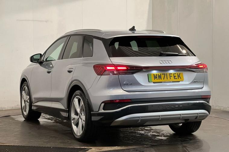 This 2021 Audi Q4 e-tron S line boasts a clear vehicle history and has been owned by just one person, offering peace of mind for its next owner. This electric SUV features an 82 kWh battery, providing a maximum range of 303 miles when new, and comes equipped with LED headlights and daytime running lights for enhanced visibility. Inside, youll find comfort features like auxiliary air conditioning and 3-zone electronic climate control, alongside a Bluetooth interface for seamless connectivity. Rear parking sensors are also included, aiding in manoeuvrability. With only 33, 448 miles on the clock, this Q4 e-tron is considered low mileage for its age, and its MOT is valid until December 2026. The large boot space offers practicality for everyday needs and longer journeys. Charging is convenient, with a full charge at home taking approximately 11 hours and 30 minutes using a 7kW charger, while rapid public charging can take the battery from empty to 80% in just 30 minutes. These attributes demonstrate the excellent condition and capability of this Audi Q4 e-tron.