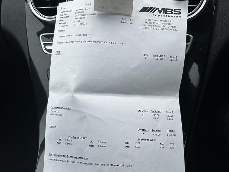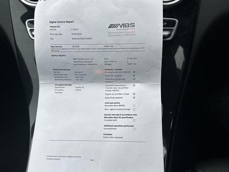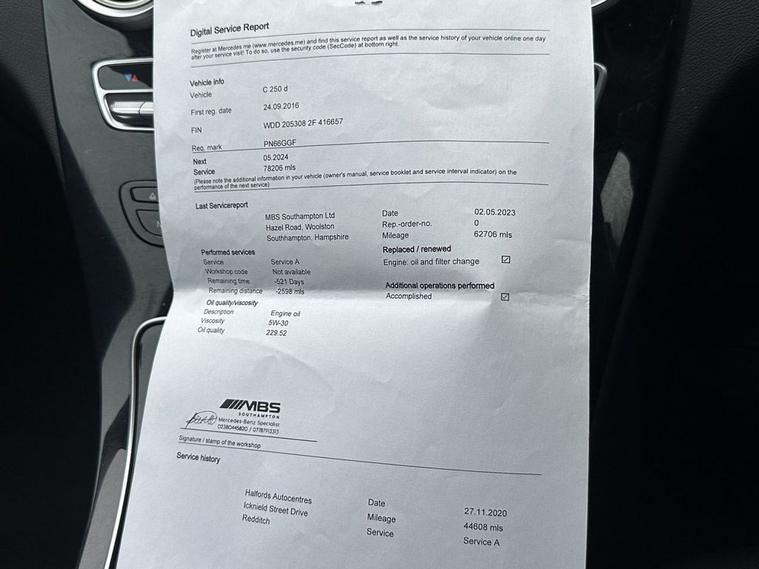This 2016 Mercedes-Benz C Class C250d Sport is presented with a clear vehicle history check, offering peace of mind for its next owner. This stylish saloon features a powerful yet efficient 2.1L Euro 6 diesel engine, paired with the desirable Sport trim. Inside, youll find comfort and convenience with THERMATIC automatic climate control for two zones and heated front seats. For enhanced visibility and safety, it is equipped with LED High Performance headlamps and integrated LED daytime running lights, alongside a reversing camera to aid with parking. The Bluetooth interface ensures seamless hands-free telephone connectivity. Experience impressive performance with this C250d Sport, capable of accelerating from 0 to 60mph in just 6.7 seconds. This model also boasts excellent fuel economy, achieving a remarkable 67 mpg, and benefits from low CO2 emissions, indicating it is more economical and environmentally friendly than many similar vehicles. These highlights demonstrate the superior efficiency and dynamic capability of this Mercedes-Benz C Class.