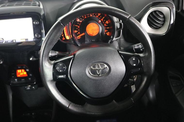 This desirable Toyota Aygo x-clusiv finished in Bold Black looks fantastic complemented by 15 inch Alloy Wheels and LED Running Lights. Enjoy economical motoring with JUST £20 ROAD TAX, up to 78 MPG and CHEAP INSURANCE. Find your way with integrated SATELLITE NAVIGATION with 7 inch TOUCHSCREEN Display. Keep connected to your Phones APPS through MIRROR LINK. Park in ease with REVERSE CAMERA. Listen to your music through DAB Digital Radio. Keep connected with BLUETOOTH Phone System with USB port and Music Streaming. Comfortable to drive with Auto CLIMATE CONTROLLED AIR CONDITIONING and Speed Limiting Function. Also equipped with ISOFIX seats, Auto Headlights, Multifunctional Steering Wheel, Immobiliser and Remote Door Locking with 2 x keys. Buy in confidence with JUST 2 OWNERS from new and SERVICE HISTORY with 7 x Documented Services.