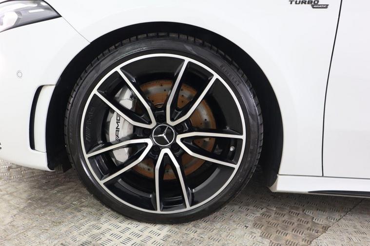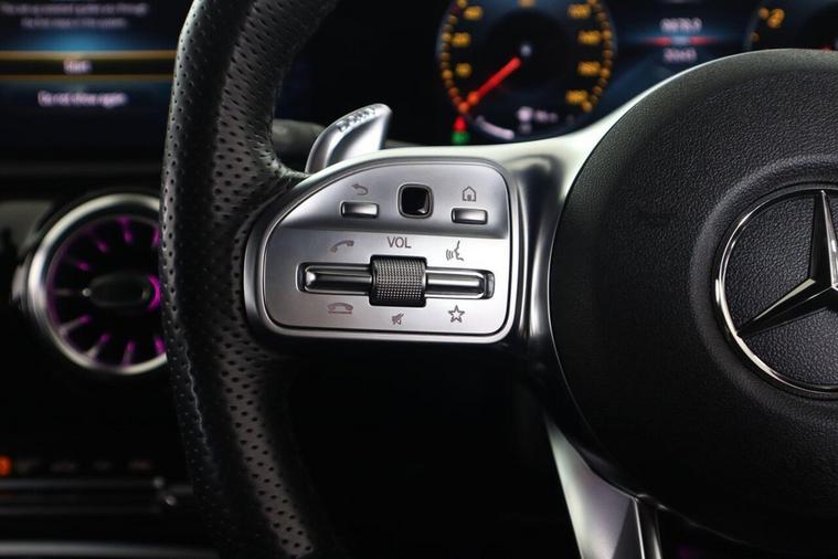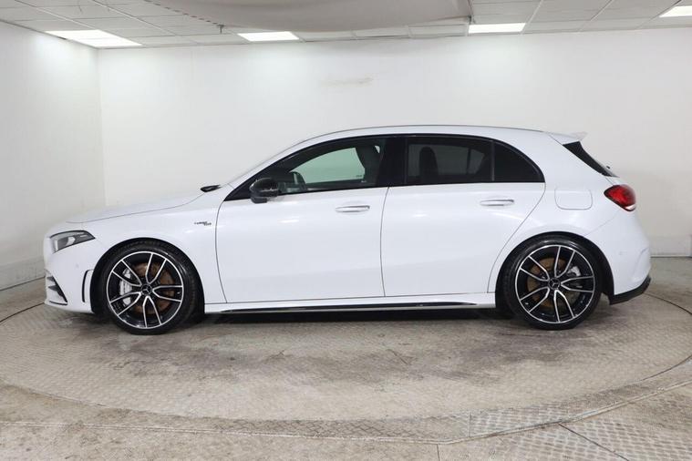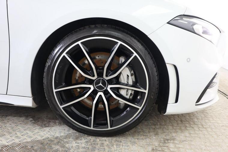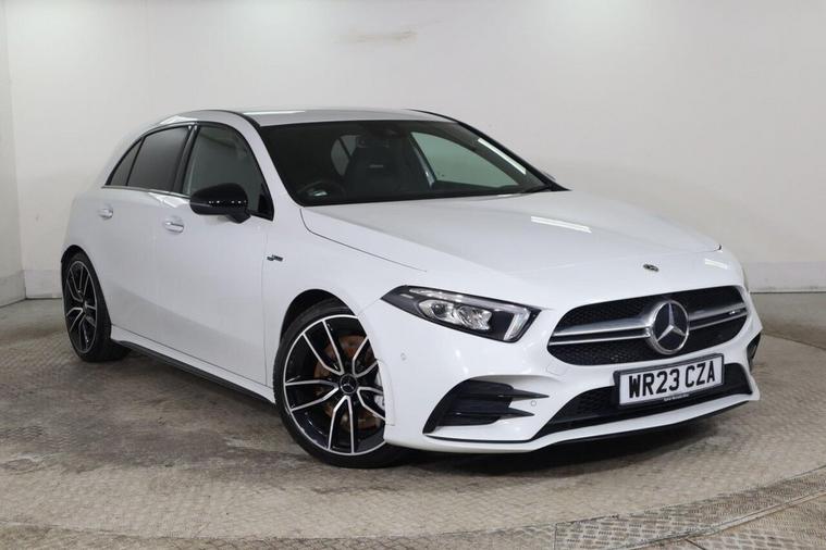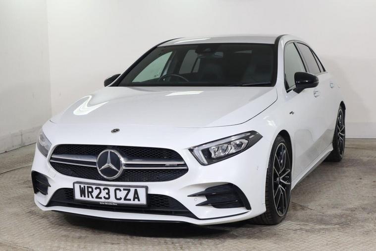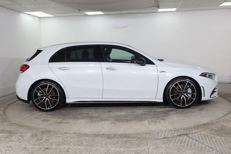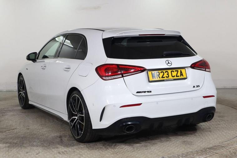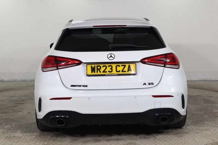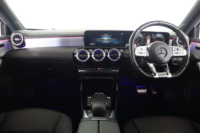This 2023 Mercedes Benz A Class A35 AMG Premium offers an exhilarating driving experience with its powerful 2.0 litre petrol engine and four wheel drive system. As a Euro 6 compliant vehicle, it combines performance with efficiency. The AMG trim level is evident in the striking AMG Bodystyling, featuring an AMG front apron with a front splitter, AMG side sill panels, and an AMG rear apron with visible exhaust tailpipe trim elements. Distinctive BITURBO 4MATIC lettering adorns the front wings, while the window line is finished in sleek black. Practicality is also considered, with a stowage compartment in the centre console featuring a retractable cover and LED tail lamps for enhanced visibility. The performance of this A35 AMG is truly impressive, capable of accelerating from 0 to 62 miles per hour in just 4.7 seconds, demonstrating its superior acceleration compared to similar vehicles. Beyond its speed, this Mercedes Benz also boasts a large boot space, offering ample room for luggage or shopping, making it a versatile choice for both daily commutes and longer journeys.
