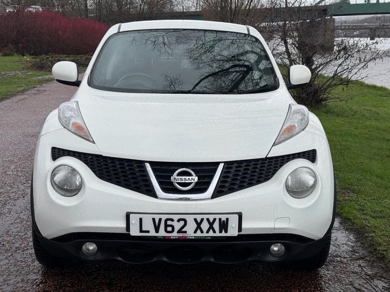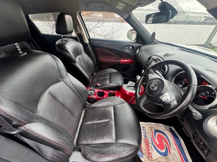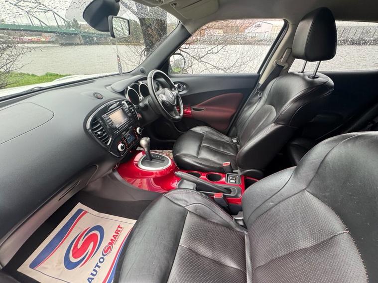 STUNNING NISSAN JUKE AUTOMATIC IN WHITE WITH PRIVACY GLASS, 17 ALLOY WHEELS, FULL BLACK LEATHER INTERIOR, HEATED FRONT SEATS, AIR CON, ELECTRIC MIRRORS, SAT NAV, BLUETOOTH, MULTI FUNCTIONING STEERING WHEEL, CRUISE CONTROL AND LOTS MORE, THIS CAR ALSO COMES WITH A MASSIVE SERVICE HISTORY WITH 8 STAMPS IN THE BOOK, WE WILL ALSO PROVIDE YOU WITH A FRESH SERVICE, MOT AND WARRANTY.
