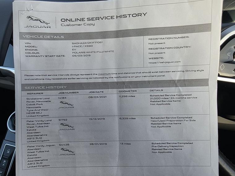 This 2019 Jaguar I-PACE 400 SE boasts exceptionally low mileage for its age, having covered just 28, 594 miles, and comes with a clear vehicle history check. As an all electric, Four Wheel Drive model, this I-PACE offers a substantial 90 kWh battery with a maximum range of 292 miles when new. It features Premium LED Headlights with Signature DRL, Keyless Entry, and 10-Way Electric Memory Front Seats for added comfort and convenience. The Drive Pack includes Adaptive Cruise Control and Blind Spot Assistance, while Bluetooth Connectivity ensures seamless integration of your devices. The I-PACE 400 SE excels with its impressive performance, achieving 0-60mph in a swift 4.5 seconds, demonstrating its dynamic capabilities. This acceleration figure highlights its superior performance compared to many other vehicles in its class. Charging is also efficient, with a full charge from empty taking approximately 12 hours and 36 minutes on a 7kW home charger, and a rapid charge to 80% possible in just 50 minutes at a public charging station. These charging times underscore the practicality and convenience of electric ownership with this Jaguar.