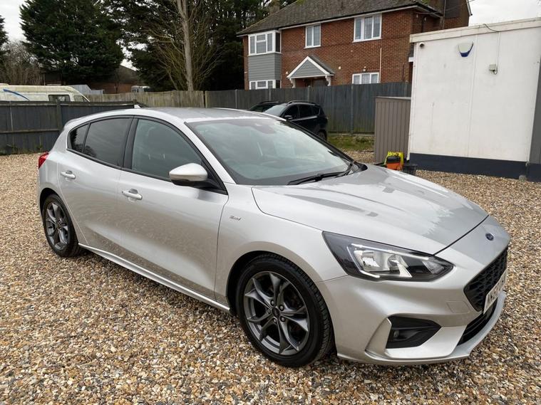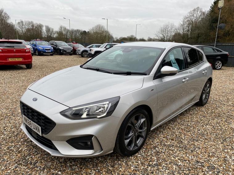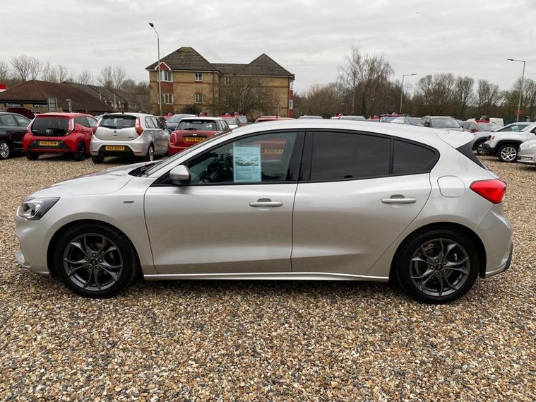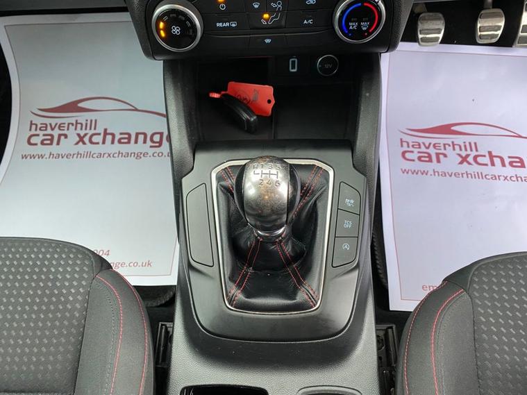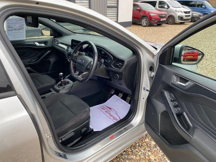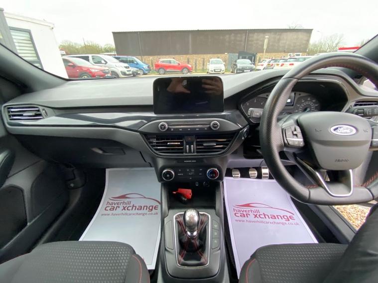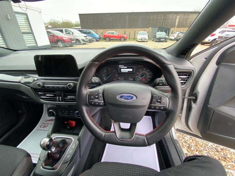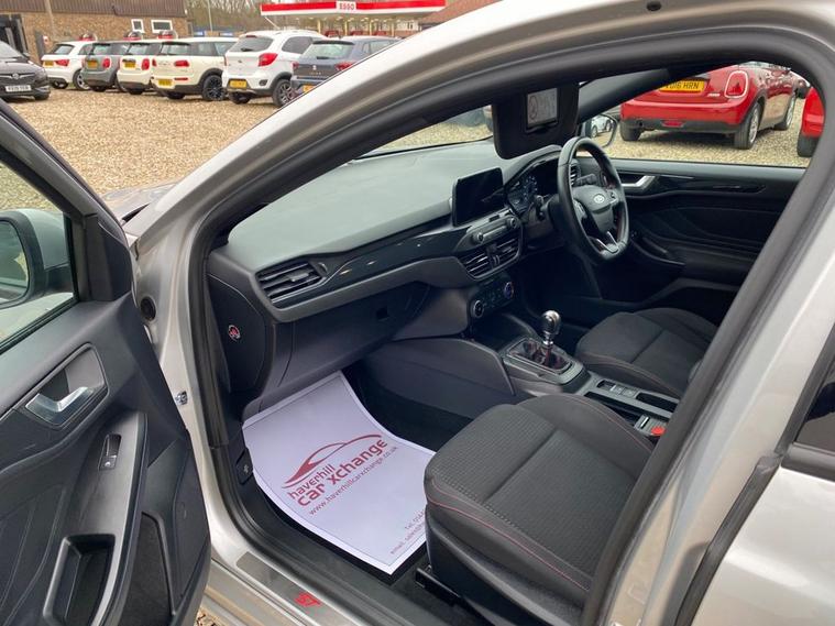 6.5 INCH TOUCHSCREEN- FORD SYNC3 DAB RADIO+AIR-CONDITIONING+LANE KEEPING AID WITH LANE ASSIST+AUTOMATIC HEADLIGHT ACTIVATION+FRONT STYLE SPORTS SEATS+MOONDUST SILVER PAINT+17 INCH ALLOY WHEELS. At Haverhill Car Xchange we would like to offer you our Ford Focus ST-Line Hatchback which has been finished in a metallic Moondust Silver paint, Charcoal Black View Cloth upholstery with Red Stitching. Specification Includes a 6.5 Inch Touchscreen which features Ford SYNC 3 DAB Radio, Air-Conditioning, Lane Keeping Aid with Lane Departure Warning, Cruise Control with Speed Limiter, Front and Rear Electrically Operated Front and Rear Windows with One-Touch Opening and Closing, Selectable Drive Mode, Body Coloured Bumpers/Door Handles/Rear Roof Spoiler and Door Mirrors with Integrated Side Indicators, Automatic Headlight Activation, LED Daytime Running Lights, Halogen Headlights, Keyless Start with Ford Power Start Button, Alloy Finish Pedals, ST-Line Stainless Steel Scuff Plates, 3-Spoke Leather Flat Bottomed Multifunction Steering Wheel with Red Stitching, Quickclear Heated Windscreen, Rear Privacy Glass, Electric Parking Break, 17 Inch Alloy Wheels, Electric Power Assisted Steering, ABS Breaking System, Airbags, Alarm, Immobiliser, Remote Central Locking and ISOFIX Anchorage Points for Child Seats.