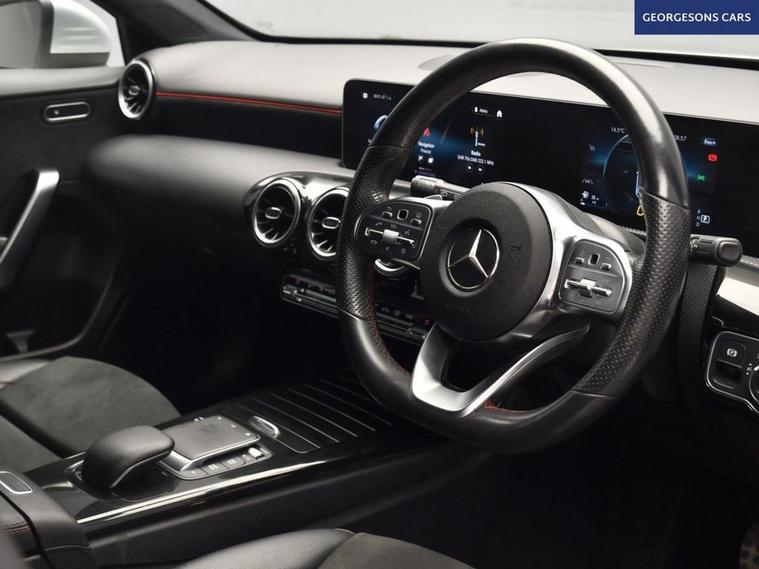 This Mercedes-Benz A-Class 1.3 A180 AMG Line (Executive) combines a responsive 1.3-litre turbo petrol engine with 136hp, delivering 0-62mph in 9.2 seconds and up to 52.3mpg in this front-wheel-drive setup with a smooth 7-speed DCT automatic transmission. The AMG Line (Executive) trim enhances the sporty appeal with premium features, and a dynamic chassis for refined performance. Navigate effortlessly with integrated satellite navigation, Apple CarPlay, Bluetooth, and DAB radio, ensuring seamless connectivity on every journey. Parking is a breeze thanks to the reverse camera and parking sensors, providing clear visibility and confidence in tight spaces. Stay comfortable with dual-zone climate control and heated seats, offering personalized warmth year-round. Cruise control with speed limiter and lane assist enhance safety and relaxation on highways. Blind spot assist adds extra security, while selectable drive modes provide tailored performance, whether for efficiency or dynamic driving. Start-stop technology improves fuel economy in traffic. The spacious five-door hatchback design includes a 370-litre boot for practicality.