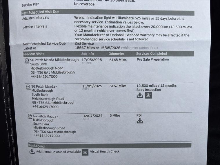This 2024 Mazda MX-30 Makoto is a remarkable electric vehicle with exceptionally low mileage for its age, having covered just 8486 miles. As an electric model, it offers a smooth and quiet driving experience, powered by a 36 kWh battery that provides a maximum range of 124 miles on a full charge. Recharging at home is convenient, taking approximately 4 hours with a 7kW charger, while rapid public charging can replenish the battery from empty to 80% in as little as 33 minutes. This Makoto trim is well equipped, featuring climate control air conditioning, front and rear parking sensors with audible and visual warnings, and a heated steering wheel for added comfort. The Mazda MX-30 Makoto stands out with its advanced technology, including a Head Up Display to keep essential information in your line of sight and Blind Spot Monitoring to enhance safety. These features demonstrate a commitment to driver convenience and awareness, setting it apart from other vehicles in its class. The combination of its electric powertrain, impressive charging capabilities, and thoughtful features makes this 2024 Mazda MX-30 Makoto a compelling choice for those seeking an efficient and well appointed electric car.