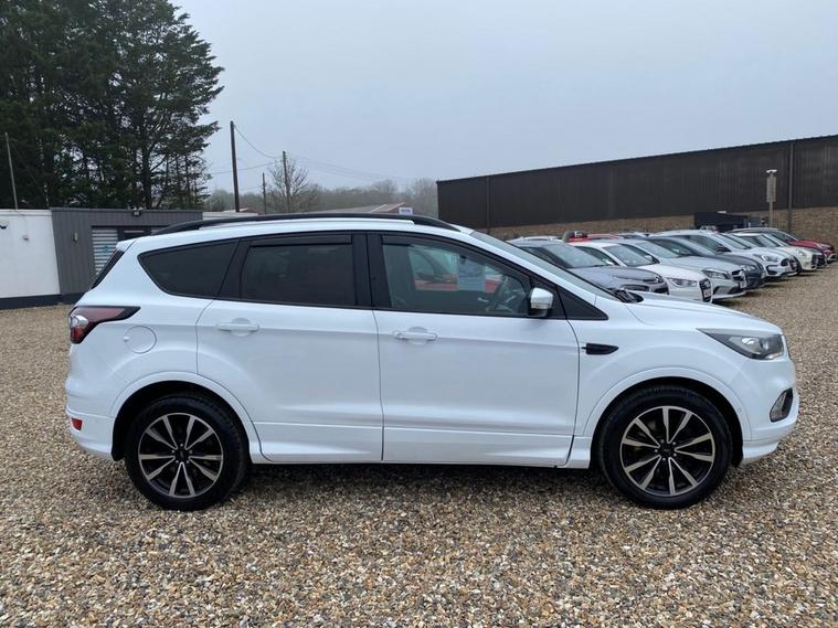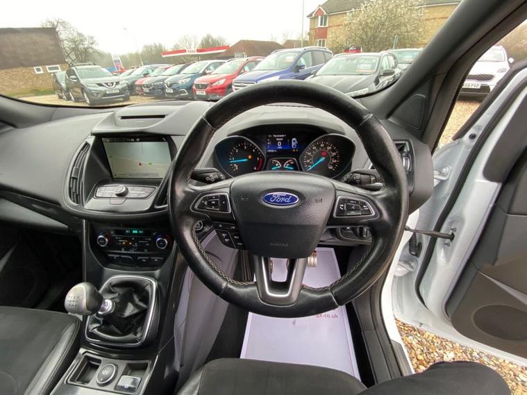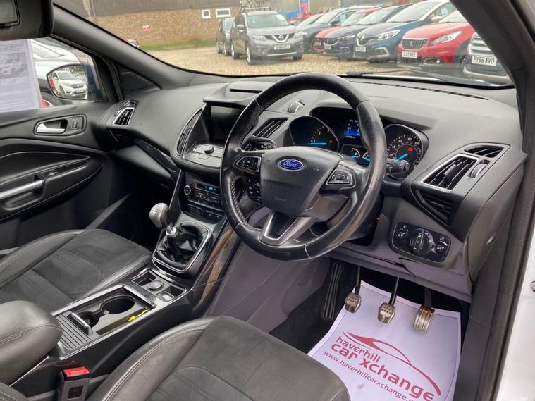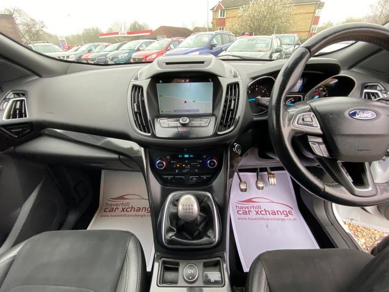 8 INCH TOUCHSCREEN WHICH SYNC 3 DAB SATELLITE NAVIGATION SYSTEM+DUAL ZONE CLIMATE CONTROL AIR-CONDITIONING+AUTOMATIC HEADLIGHT ACTIVATION+RAIN-SENSING WINDSCREEN WIPERS+PARKING ASSISTANCE+HALF LEATHER UPHOLSTERY+FROZEN WHITE PAINT+18 INCH ALLOY WHEELS. At Haverhill Car Xchange we would like to offer you our Ford Kuga ST-Line SUV which has been finished in a Frozen White paint with Charcoal Black half leather and cloth upholstery. Excellent Specification Includes an 8 Inch Touchscreen which featured Ford SYNC 3 with DAB Satellite Navigation System, Audible Text Messaging-Voice Control and USB Connectivity, 12 Volt Power Socket in Front and Rear, Dual Zone Climate Control Air-Conditioning, Gear Shift Indicator, Cruise Control with Speed Limiter, Electric Front and Rear Windows with Global Opening-Closing and One-Touch, Body Coloured Bumpers/Door Handles/Rear Spoiler and Door Mirrors with Integrated Side Indicators-Power Folding with Puddle Lights, Black Front Grille, Front Scuff Plates, Automatic Headlight Activation, LED Daytime Running Lights, Front Fog Lights, Auto Dimming Rear-View Mirror, Rain-Sensing Windscreen Wipers, Parking Assistance, Leather Multifunctional Steering Wheel, Electric Parking Break, 18 Inch Alloy Wheels, Quickclear Heated Windscreen Electric Power Assisted Steering, Airbags, Alarm, Immobiliser, Remote Central Locking and ISOFIX Anchorage Points for Child Seats.
