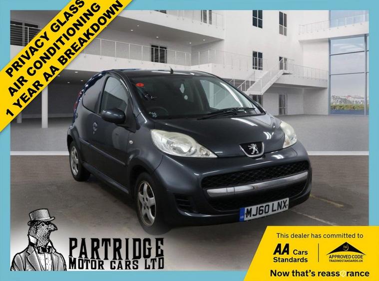HPI CLEAR, SUPPLIED WITH NEW MOT, SUPPLIED WITH NEW SERVICE, AIR CONDITIONING, ALLOY WHEELS, PRIVACY GLASS, LOW MILEAGE, CHEAP INSURANCE, 5 DOOR, MANUAL, 3 MONTHS WARRANTY, 1 YEAR AA BREAKDOWN, AA DEALER **2010 Peugeot 107 1.0 Envy: Low Mileage, Air Con, New MOT! AA Approved!** ******** A fantastic, high-specification example of the ultimate budget-friendly city car! This is the 2010 Peugeot 107 in the highly desirable and rare Envy specification, finished in the sophisticated **Carbon Grey** metallic. Boasting **Low Mileage**, this vehicle drives superbly and feels remarkably fresh for its year. The Envy trim comes loaded with fantastic styling upgrades often missing from basic city cars, most notably sporty **Alloy Wheels** and sleek **Privacy Glass**, alongside the essential comfort of **Air Conditioning**. With its highly sought-after **5-Door** layout, it ensures excellent practicality for rear passengers. Powered by the legendary Toyota-derived **1.0L petrol engine**, it offers bulletproof reliability, incredible fuel economy, and **Cheap Insurance**. ******** **Key Features:** *** **Low Mileage**: A lightly used example that feels tight and responsive. *** **Envy Specification**: A highly desirable premium trim adding fantastic sporty styling. *** **Air Conditioning**: Essential for keeping the cabin cool and comfortable all year round. *** **Carbon Grey Paintwork**: A timeless, smart finish that perfectly suits the 107. *** **Alloy Wheels**: Stylish factory-fitted wheels complementing the cars modern stance. *** **Privacy Glass**: Factory-tinted rear windows for added style and rear cabin comfort. *** **1.0L Petrol Engine**: A robust Toyota-derived 3-cylinder engine that is incredibly cheap to run. *** **Cheap Insurance**: Sits in a very low insurance group, keeping annual premiums to a minimum. *** **5-Door Practicality**: Maximum convenience for rear passengers, child seats, or shopping. ******** **Buy with Confidence:** *** **HPI Clear**: Verified history check. *** **Supplied with a New Service**: Freshly prepared by our expert mechanics. *** **Supplied with a New MOT**: A full 12-month certificate for the new owner. *** **3 Months Warranty**: Comprehensive cover included for reassurance. *** **1 Year Breakdown Cover**: Nationwide AA assistance included. *** **AA Approved Dealer**: Inspected to exacting AA standards. ******** **Partridge Motor Cars - Your Trusted AA Dealer:** We are 5-star rated for a reason! Every vehicle undergoes a meticulous inspection to meet our high expectations. ******** **Interested?** *** Call **01403485928** or visit * dealer's website to book a viewing. *** Finance Available: Flexible options to drive away today. *** Part Exchange Welcome: Trade in your old car for a great deal.